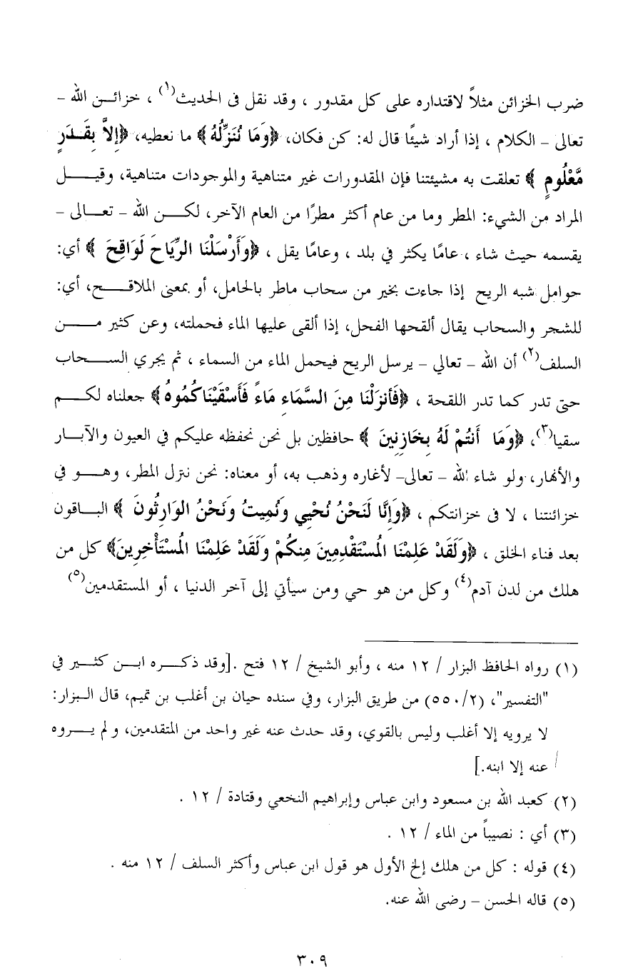 ضرب الخزائن مثلاً لاقتداره على كل مقدور، وقد نقل في الحديث، خزائن الله - تعالى - الكلام، إذا أراد شيئًا قال له: كن فكان، (وَمَا نُنَزِّلُهُ) ما نعطيه، (إِلَّا بِقَدَرٍ مَّعْلُومٍ) تعلقت به مشيئتنا فإن المقدورات غير متناهية والموجودات متناهية، وقيل المراد من الشيء: المطر وما من عام أكثر مطرًا من العام الآخر، لكن الله - تعالى - يقسمه حيث شاء، عامًا يكثر في بلد، وعامًا يقل، (وَأَرْسَلْنَا الرِّيَاحَ لَوَاقِحَ) أي: حوامل شبه الريح إذا جاءت بخير من سحاب ماطر بالحامل، أو بمعنى اللاقح، أي: للشجر والسحاب يقال ألقحها الفحل، إذا ألقى عليها الماء فحملته، وعن كثير من السلف أن الله - تعالي - يرسل الريح فيحمل الماء من السماء، ثم يجري السحاب حتى تدر كما تدر اللقحة، (فَأنزَلْنَا مِنَ السَّمَاءِ مَاءً فَأَسْقَيْنَاكُمُوهُ) جعلناه لكم سقيا، (وَمَا أَنْتُمْ لَهُ بِخَازِنِينَ) حافظين بل نحن نحفظه عليكم في العيون والآبار والأنهار، ولو شاء الله - تعالى - لأغاره وذهب به، أو معناه: نحن ننزل المطر، وهو في خزائننا، لا في خزانتكم، (وَإِنَّا لَنَحْنُ نُحْيِي وَنُمِيتُ وَنَحْنُ الْوَارِثُونَ) الباقون بعد فناء الخلق، (وَلَقَدْ عَلِمْنَا الْمُسْتَقْدِمِينَ مِنْكُمْ وَلَقَدْ عَلِمْنَا الْمُسْتَأْخِرِينَ) كل من هلك من لدن آدم وكل من هو حي ومن سيأتي إلى آخر الدنيا، أو المستقدمين