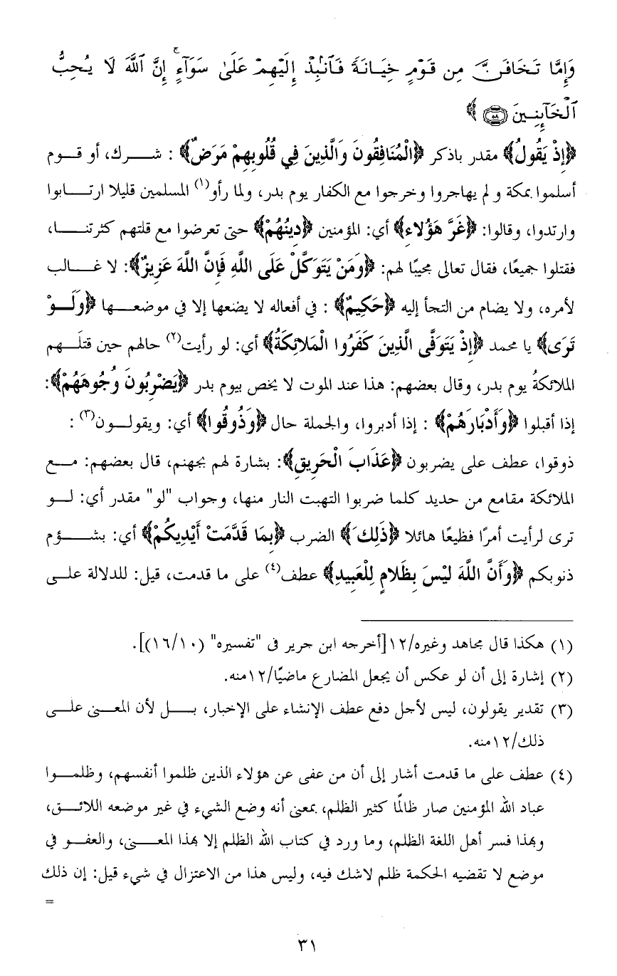 (إِذْ يَقُولُ) مقدر باذكر (الْمُنَافِقُونَ وَالَّذِينَ فِي قُلُوبِهِمْ مَرَضٌ): شرك، أو قوم أسلموا بمكة ولم يهاجروا وخرجوا مع الكفار يوم بدر، ولما رأو المسلمين قليلاً ارتابوا وارتدوا، وقالوا: (غرَّ هَؤلاءِ) أي: المؤمنين (دِينُهُمْ) حتى تعرضوا مع قلتهم كثرتنا، فقتلوا جميعًا، فقال تعالى مجيبًا لهم: (وَمَنْ يَتَوَكَّلْ عَلَى اللهِ فَإِنَّ اللهَ عَزِيزٌ): لا غالب لأمره، ولا يضام من التجأ إليه (حَكِيمٌ): في أفعاله لا يضعها إلا في موضعها (وَلَوْ تَرَى) يا محمد (إِذْ يَتَوَفَّى الذِينَ كَفَرُوا الْمَلَائِكَةُ) أي: لو رأيت حالهم حين قتلَهم الملائكةُ يوم بدر، وقال بعضهم: هذا عند الموت لا يخص بيوم بدر (يَضْرِبون وجُوهَهمْ): إذا أقبلوا (وَأَدْبَارَهمْ): إذا أدبروا، والجملة حال (وَذوقوا) أي: ويقولون: