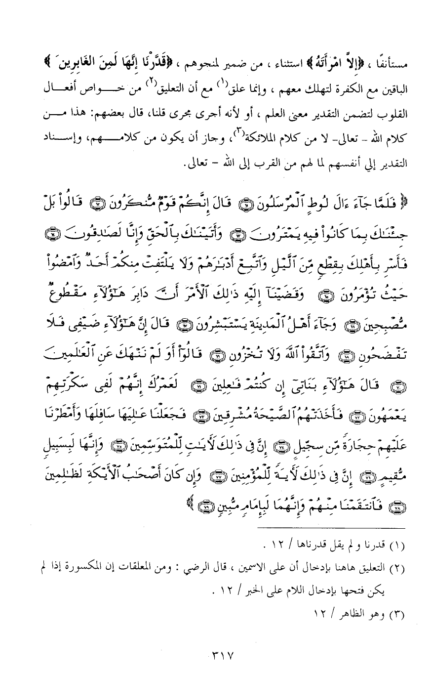 (فَلَمَّا جَاءَ آلَ لُوطٍ الْمُرْسَلُونَ (61) قَالَ إِنَّكُمْ قَوْمٌ مُنْكَرُونَ (62) قَالُوا بَلْ جِئْنَاكَ بِمَا كَانُوا فِيهِ يَمْتَرُونَ (63) وَأَتَيْنَاكَ بِالْحَقِّ وَإِنَّا لَصَادِقُونَ (64) فَأَسْرِ بِأَهْلِكَ بِقِطْعٍ مِنَ اللَّيْلِ وَاتَّبِعْ أَدْبَارَهُمْ وَلَا يَلْتَفِتْ مِنْكُمْ أَحَدٌ وَامْضُوا حَيْثُ تُؤْمَرُونَ (65) وَقَضَيْنَا إِلَيْهِ ذَلِكَ الْأَمْرَ أَنَّ دَابِرَ هَؤُلَاءِ مَقْطُوعٌ مُصْبِحِينَ (66) وَجَاءَ أَهْلُ الْمَدِينَةِ يَسْتَبْشِرُونَ (67) قَالَ إِنَّ هَؤُلَاءِ ضَيْفِي فَلَا تَفْضَحُونِ (68) وَاتَّقُوا اللهَ وَلَا تُخْزُونِ (69) قَالُوا أَوَلَمْ نَنْهَكَ عَنِ الْعَالَمِينَ (70) قَالَ هَؤُلَاءِ بَنَاتِي إِنْ كُنْتُمْ فَاعِلِينَ (71) لَعَمْرُكَ إِنَّهُمْ لَفِي سَكْرَتِهِمْ يَعْمَهُونَ (72) فَأَخَذَتْهُمُ الصَّيْحَةُ مُشْرِقِينَ (73) فَجَعَلْنَا عَالِيَهَا سَافِلَهَا وَأَمْطَرْنَا عَلَيْهِمْ حِجَارَةً مِنْ سِجِّيلٍ (74) إِنَّ فِي ذَلِكَ لَآيَاتٍ لِلْمُتَوَسِّمِينَ (75) وَإِنَّهَا لَبِسَبِيلٍ مُقِيمٍ (76) إِنَّ فِي ذَلِكَ لَآيَةً لِلْمُؤْمِنِينَ (77) وَإِنْ كَانَ أَصْحَابُ الْأَيْكَةِ لَظَالِمِينَ (78) فَانْتَقَمْنَا مِنْهُمْ وَإِنَّهُمَا لَبِإِمَامٍ مُبِينٍ (79)