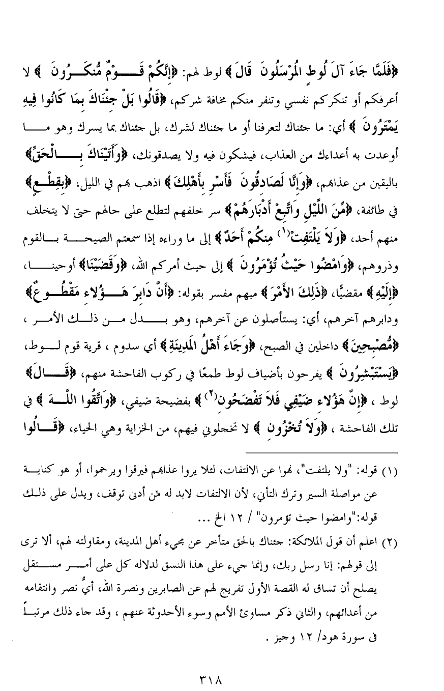 (فَلَمَّا جَاءَ آلَ لُوطٍ المُرْسَلُونَ قَالَ) لوط لهم: (إِنَّكُمْ قَوْمٌ منكَرُونَ) لا أعرفكم أو تنكركم نفسي وتنفر منكم مخافة شركم، (قَالُوا بَلْ جِئْنَاكَ بِمَا كَانوا فيهِ يَمْتَرُون) أي: ما جئناك لتعرفنا أو ما جئناك لشرك، بل جئناك بما يسرك وهو ما أوعدت به أعداءك من العذاب، فيشكون فيه ولا يصدقونك، (وَأَتَيْنَاكَ بِالْحَقِّ) باليقين من عذابهم، (وَإِنَّا لَصَادِقُونَ فَأَسْرِ بِأَهْلِكَ) اذهب بهم في الليل، (بِقِطْعٍ) في طائفة، (مِّنَ الليْلِ وَاتَّبِعْ أَدْبَارَهمْ) سر خلفهم لتطلع على حالهم حتى لا يتخلف منهم أحد، (وَلاَ يَلْتَفِتْ مِنكم أَحَدٌ) إلى ما وراءه إذا سمعتم الصيحة بالقوم وذروهم، (وَامضوا حَيثُ تؤْمَرُون) إلى حيث أمركم الله، (وَقَضيْنَا) أوحينا، (إِلَيْهِ) مقضيًّا، (ذَلِكَ الأَمْرَ) مبهم مفسر بقوله: (أَنْ دَابِرَ هَؤُلاءِ مَقْطُوعٌ) ودابرهم آخرهم، أي: يستأصلون عن آخرهم، وهو بدل من ذلك الأمر، (مُّصبِحِينَ) داخلين في الصبح، (وَجَاءَ أَهْل المَدِينَةِ) أي سدوم، قرية قوم لوط، (يَسْتَبْشرُون) يفرحون بأضياف لوط طمعًا في ركوب الفاحشة منهم، (قالَ) لوط، (إِن هَؤُلاءِ ضَيْفِي فَلاَ تَفْضَحونِ) بفضيحة ضيفى، (وَاتَّقُوا اللهَ) في تلك الفاحشة، (وَلَا تُخْزُونِ) لا تخجلوني فيهم، من الخزاية وهي الحياء، (قَالوا