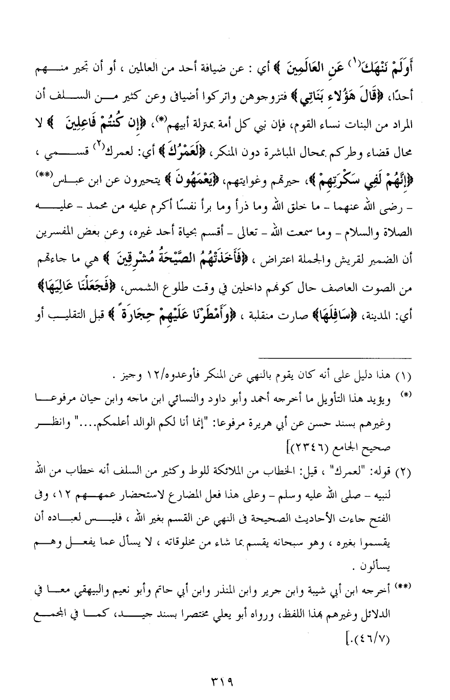 أَوَلَمْ نَنْهَكَ عَنِ الْعَالَمِينَ) أي: عن ضيافة أحد من العالمين، أو أن تجير منهم أحدًا، (قَالَ هَؤُلاءِ بَناتِي) فتزوجوهن واتركوا أضيافي وعن كثير من السلف أن المراد من البنات نساء القوم، فإن نبي كل أمة بمنزلة أبيهم، (إِن كُنتُمْ فاعِلِينَ) لا محال قضاء وطركم بمحال المباشرة دون المنكر، (لَعَمْرُكَ) أي: لعمرك قسمي، (إِنَّهُمْ لَفِي سَكْرَتِهِمْ)، حيرتهم وغوايتهم، (يَعْمَهُونَ) يتحيرون عن ابن عباس - رضى الله عنهما - ما خلق الله وما ذرأ وما برأ نفسًا أكرم عليه من محمد - عليه الصلاة والسلام - وما سمعت الله - تعالى - أقسم بحياة أحد غيره، وعن بعض المفسرين أن الضمير لقريش والجملة اعتراض، (فأَخَدتْهُمُ الصَّيْحَةُ مُشْرِقِينَ) هي ما جاءتهم من الصوت العاصف حال كونهم داخلين في وقت طلوع الشمس، (فَجَعَلنا عَالِيَهَا) أي: المدينة، (سَافِلَهَا) صارت منقلبة، (وَأَمْطَرْنَا عَلَيْهِمْ حِجَارَةً) قبل التقليب أو