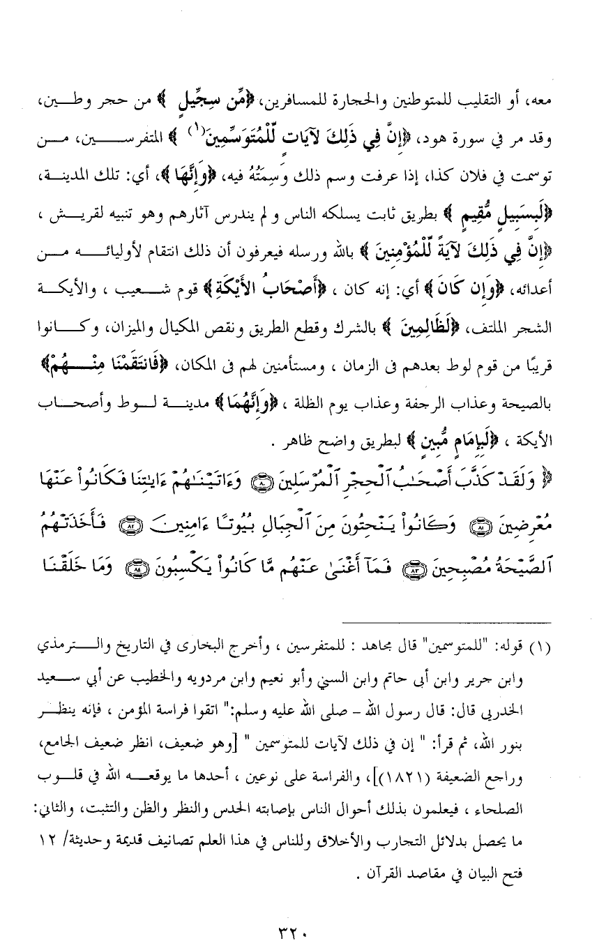 معه، أو التقليب للموطنين والحجارة للمسافرين، (مِّن سِجِّيلٍ) من حجر وطين، وقد مر في سورة هود، (إِنَّ فِي ذَلِكَ لَآيَاتٍ لِلْمُتَوَسِّمِينَ) المتفرسين، من توسمتي فلان كذا، إذا عرفت وسم ذلك وَسمَتُهُ فيه، (وَإِنها)، أي: تلك المدينة، (بِسَبِيلٍ مُقِيمٍ) بطريق ثابت يسلكه الناس ولم يندرس آثارهم وهو تنبيه لقريش، (إِنَّ فِي ذَلِكَ لَآيَةً لِلْمُؤْمِنِينَ) بالله ورسله فيعرفون أن ذلك انتقام لأوليائه من أعدائه، (وَإِن كَانَ) أي: إنه كان، (أَصْحَابُ الأَيْكَةِ) قوم شعيب، والأيكة الشجر الملتف، (لظَالِمِينَ) بالشرك وقطع الطريق ونقص المكيال والميزان، وكانوا قريبًا من قوم لوط بعدهم في الزمان، ومستأمنين لهم في المكان، (فَانْتَقَمْنَا مِنْهُمْ) بالصيحة وعذاب الرجفة وعذاب يوم الظلة، (وَإِنَّهُمَا) مدينة لوط وأصحاب الأيكة، (لَبِإِمَامٍ مُبِينٍ) لبطريق واضح ظاهر.