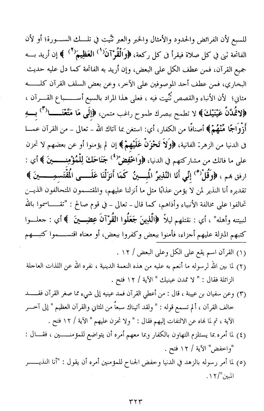 للسبع لأن الفرائض والحدود والأمثال والخبر والعبر ثنِّيت في تلك السورة؛ أو لأن الفاتحة تثني في كل صلاة فيقرأ في كل ركعة، (وَالْقُرْآنَ العَظِيمَ) إن أريد به جميع القرآن، فمن عطف الكل على البعض، وإن أريد به الفاتحة كما دل عليه حديث البخاري، فمن عطف أحد الموصوفين على الآخر، وعن بعض السلف القرآن كله مثاني؛ لأن الأنباء والقصص ثُنِّيت فيه، فعلى هذا المراد بالسبع أسباع القرآن، (لَا تَمُدَّنَّ عَيْنَيْكَ) لا تطمح ببصرك طموح راغب متمن، (إِلَى مَا مَتَّعْنَا بِهِ أَزْوَاجًا مِّنْهُمْ) أصنافًا من الكفار، أي: استغن بما آتاك الله - تعالى - من القرآن عما فى الدنيا من الزهرة الفانية، (وَلاَ تَحْزَنْ عَلَيْهِمْ) إن لم يؤمنوا أو عن بعضهم لا تحزن على ما فاتك من مشاركتهم فِي الدنيا، (وَاخْفِضْ جَنَاحَكَ لِلْمُؤْمِنِينَ) أي: ارفق بهم، (وَقُلْ إِنِّي أَنَا النَّذِيرُ الْمُبِينُ (89) كَمَا أَنْزَلْنَا عَلَى الْمُقْتَسِمِينَ) تقديره أنا النذير لمن لا يؤمن عذابًا مثل ما أنزلنا عليهم، والمقتسمون المتحالفون الذين تحالفوا على مخالفة الأنبياء وأذاهم، كما قال - تعالى - في قوم صالح: (تَقَاسَمُوا بِاللهِ لَنُبَيِّتَنَّهُ وَأَهْلَهُ)، أي: نقتلهم ليلاً (الذِينَ جَعَلُوا القُرْآنَ عِضِينَ) أي: جعلوا كتبهم المنزلة عليهم أجزاء، فآمنوا ببعض وكفروا ببعض، أو معناه اقتسموا كتبهم