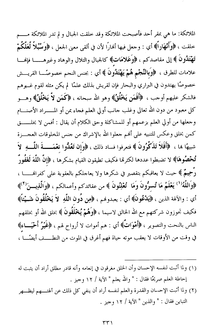 الملائكة: ما هي بمقر أحد فأصبحت الملائكة وقد خلقت الجبال ولم تدر الملائكة مم خلقت، (وَأَنْهَارًا) أي: وجعل فيها أنهارًا لأن في ألقى معنى الجعل، (وَسُبُلًا لَعَلَّكُمْ تَهْتَدُونَ) إلى مقاصدكم، (وَعَلامَاتٍ) كالجبال والتلال والوهاد وغيرها فإنها علامات للطرق، (وَبِالنَّجْمِ هُمْ يَهْتَدُونَ) أي: بجنس النجم خصوصًا لقريش خصوصًا يهتدون في البراري والبحار فإن لقريش بذلك علمًا لم يكن مثله لقوم غيرهم فالشكر عليهم أوجب، (أَفَمَن يَخْلُقُ) وهو الله سبحانه، (كَمَن لَا يَخْلُقُ) وهو كل معبود من دون الله تعالى وغلب جانب أولي العلم فجاء بمن أو المراد الأصنام وجعلها من أولي العلم بزعمهم أو للمشاكلة وحق الكلام أن يقال: أفمن لا يخلق كمن يخلق وعكس للتنبيه على أنَّهم جعلوا الله بالإشراك من جنس المخلوقات العجزة شبيهًا بها، (أَفَلاَ تَذَكرُونَ) فتعرفوا فساد ذلك، (وَإِن تَعُدُّوا نِعْمَةَ اللهِ لاَ تُحْصُوهَا) لا تضبطوا عددها لكثرتها فكيف تطيقون القيام بشكرها، (إِنَّ اللهَ لَغَفُورٌ رحيمٌ) حيث لا يعاقبكم بتقصير في شكرها ولا يعاجلكم بالعقوبة على كفرانها، (وَاللهُ يَعْلَمُ مَا تُسِرُّونَ وَمَا تُعْلِنُونَ) من عقائدكم وأعمالكم، (وَالَّذِينَ) أي: والآلهة الذين، (يَدْعُونَ) أي: يعبدونهم، (مِن دُونِ اللهِ لاَ يَخْلُقُونَ شَيْئًا) فكيف تجوزون شركتهم مع الله الخالق لا سيما، (وَهُمْ يُخْلَقُون) بخلق الله أو بخلقهم الناس بالنحت والتصوير، (أَمْوَاتٌ) أي: هم أموات لا أرواح لهم، (غيرُ أَحْيَاءٍ) في وقت من الأوقات لا يعقب موته حياة فهم أغرق في الموت من النطف أيضًا،