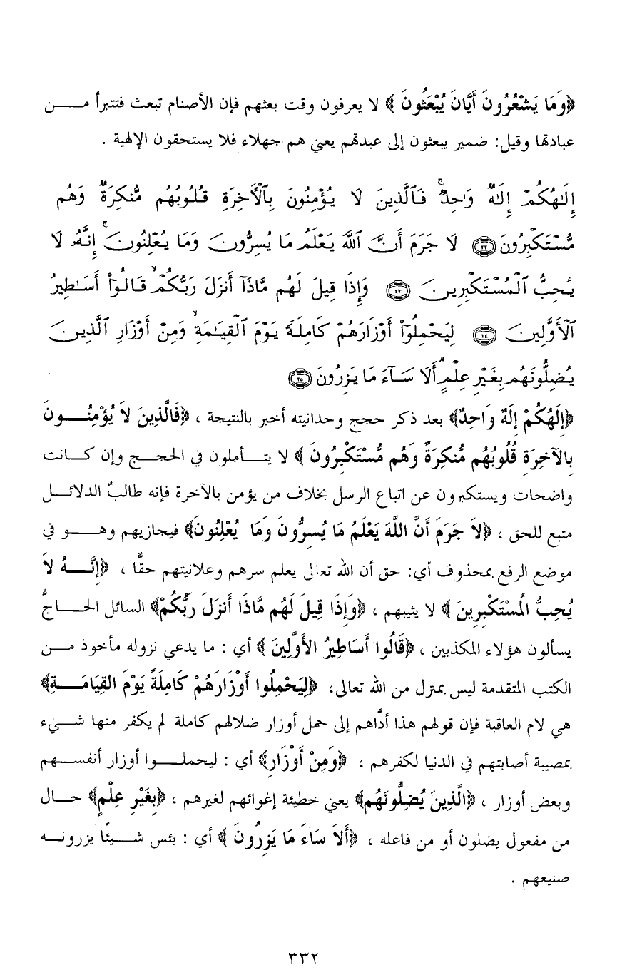 (إِلَهُكُمْ إِلَهٌ وَاحِدٌ فَالَّذِينَ لَا يُؤْمِنُونَ بِالْآخِرَةِ قُلُوبُهُمْ مُنْكِرَةٌ وَهُمْ مُسْتَكْبِرُونَ (22) لَا جَرَمَ أَنَّ اللهَ يَعْلَمُ مَا يُسِرُّونَ وَمَا يُعْلِنُونَ إِنَّهُ لَا يُحِبُّ الْمُسْتَكْبِرِينَ (23) وَإِذَا قِيلَ لَهُمْ مَاذَا أَنْزَلَ رَبُّكُمْ قَالُوا أَسَاطِيرُ الْأَوَّلِينَ (24) لِيَحْمِلُوا أَوْزَارَهُمْ كَامِلَةً يَوْمَ الْقِيَامَةِ وَمِنْ أَوْزَارِ الَّذِينَ يُضِلُّونَهُمْ بِغَيْرِ عِلْمٍ أَلَا سَاءَ مَا يَزِرُونَ (25)