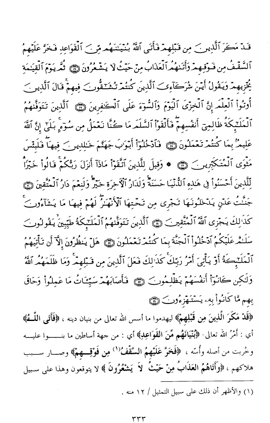 (قَدْ مَكَرَ الَّذِينَ مِنْ قَبْلِهِمْ فَأَتَى اللهُ بُنْيَانَهُمْ مِنَ الْقَوَاعِدِ فَخَرَّ عَلَيْهِمُ السَّقْفُ مِنْ فَوْقِهِمْ وَأَتَاهُمُ الْعَذَابُ مِنْ حَيْثُ لَا يَشْعُرُونَ (26) ثُمَّ يَوْمَ الْقِيَامَةِ يُخْزِيهِمْ وَيَقُولُ أَيْنَ شُرَكَائِيَ الَّذِينَ كُنْتُمْ تُشَاقُّونَ فِيهِمْ قَالَ الَّذِينَ أُوتُوا الْعِلْمَ إِنَّ الْخِزْيَ الْيَوْمَ وَالسُّوءَ عَلَى الْكَافِرِينَ (27) الَّذِينَ تَتَوَفَّاهُمُ الْمَلَائِكَةُ ظَالِمِي أَنْفُسِهِمْ فَأَلْقَوُا السَّلَمَ مَا كُنَّا نَعْمَلُ مِنْ سُوءٍ بَلَى إِنَّ اللهَ عَلِيمٌ بِمَا كُنْتُمْ تَعْمَلُونَ (28) فَادْخُلُوا أَبْوَابَ جَهَنَّمَ خَالِدِينَ فِيهَا فَلَبِئْسَ مَثْوَى الْمُتَكَبِّرِينَ (29) وَقِيلَ لِلَّذِينَ اتَّقَوْا مَاذَا أَنْزَلَ رَبُّكُمْ قَالُوا خَيْرًا لِلَّذِينَ أَحْسَنُوا فِي هَذِهِ الدُّنْيَا حَسَنَةٌ وَلَدَارُ الْآخِرَةِ خَيْرٌ وَلَنِعْمَ دَارُ الْمُتَّقِينَ (30) جَنَّاتُ عَدْنٍ يَدْخُلُونَهَا تَجْرِي مِنْ تَحْتِهَا الْأَنْهَارُ لَهُمْ فِيهَا مَا يَشَاءُونَ كَذَلِكَ يَجْزِي اللهُ الْمُتَّقِينَ (31) الَّذِينَ تَتَوَفَّاهُمُ الْمَلَائِكَةُ طَيِّبِينَ يَقُولُونَ سَلَامٌ عَلَيْكُمُ ادْخُلُوا الْجَنَّةَ بِمَا كُنْتُمْ تَعْمَلُونَ (32) هَلْ يَنْظُرُونَ إِلَّا أَنْ تَأْتِيَهُمُ الْمَلَائِكَةُ أَوْ يَأْتِيَ أَمْرُ رَبِّكَ كَذَلِكَ فَعَلَ الَّذِينَ مِنْ قَبْلِهِمْ وَمَا ظَلَمَهُمُ اللهُ وَلَكِنْ كَانُوا أَنْفُسَهُمْ يَظْلِمُونَ (33) فَأَصَابَهُمْ سَيِّئَاتُ مَا عَمِلُوا وَحَاقَ بِهِمْ مَا كَانُوا بِهِ يَسْتَهْزِءُونَ (34)