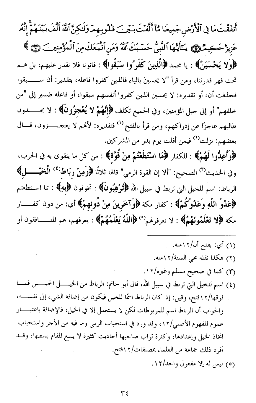 (وَأَعِدُّوا لَهُمْ): للكفار (مَا اسْتَطَعْتُمْ مِنْ قُوَّةٍ): من كل ما يتقوى به في الحرب، وفي الحديث الصحيح: " ألا إن القوة الرمي " قالها ثلاثًا (وَمِنْ رِبَاطِ الْخَيْلِ) الرباط: اسم للخيل التي تربط في سبيل الله (تُرْهِبُونَ): تخوفون (به): بما استطعتم (عَدُوَّ اللهِ وَعَدُوَّكُمْ): كفار مكة (وَآخَرِينَ مِنْ دُونِهِمْ) أي: من دون كفار مكة (لَا تَعْلَمُونَهُمُ): لا تعرفونهم (اللهُ يَعْلمُهُمْ): يعرفهم، هم المنافقون أو