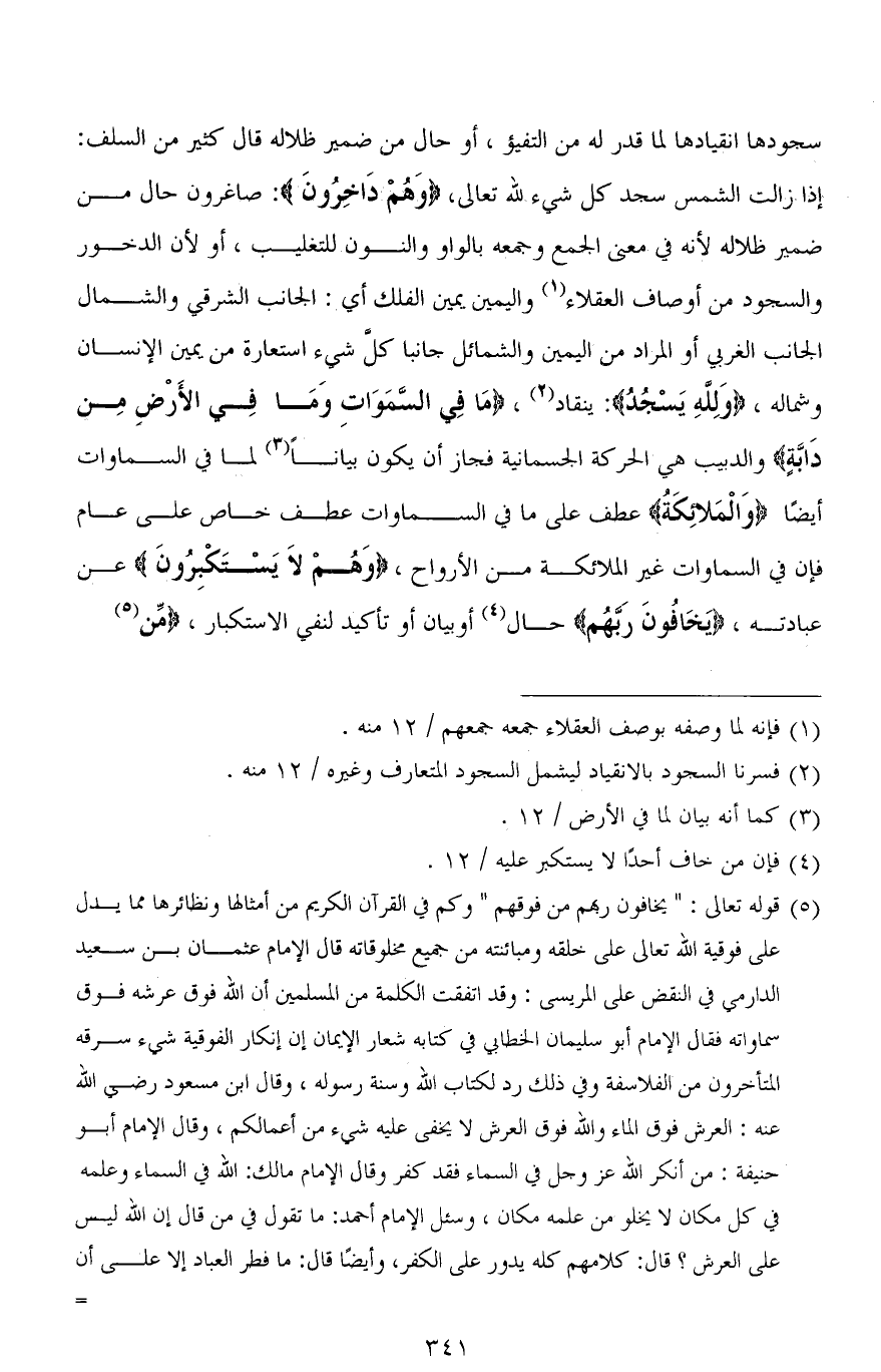 سجودها انقيادها لما قدر له من التفيؤ، أو حال من ضمير ظلاله قال كثير من السلف: إذا زالت الشمس سجد كل شىء لله تعالى، (وَهُمْ دَاخِرُونَ): صاغرون حال من ضمير ظلاله لأنه في معنى الجمع وجمعه بالواو والنون للتغليب، أو لأن الدخور والسجود من أوصاف العقلاء واليمين يمين الفلك أي: الجانب الشرقي والشمال الجانب الغربي أو المراد من اليمين والشمائل جانبا كل شيء استعارة من يمين الإنسان وشماله، (وَلله يَسْجُدُ): ينقاد، (مَا فِي السَّمَاوَاتِ وَمَا فِي الأَرْضِ مِن دَابَّةٍ) والدبيب هي الحركة الجسمانية فجاز أن يكون بيانًا لما في السماوات أيضًا (وَالْمَلائكَةُ) عطف على ما في السماوات عطف خاص على عام فإن في السماوات غير الملائكة من الأرواح، (وَهُمْ لاَ يَسْتكبرُون) عن عبادته، (يَخَافُونَ رَبَّهُم) حال أو بيان أو تأكيد لنفي الاستكبار، (مِن