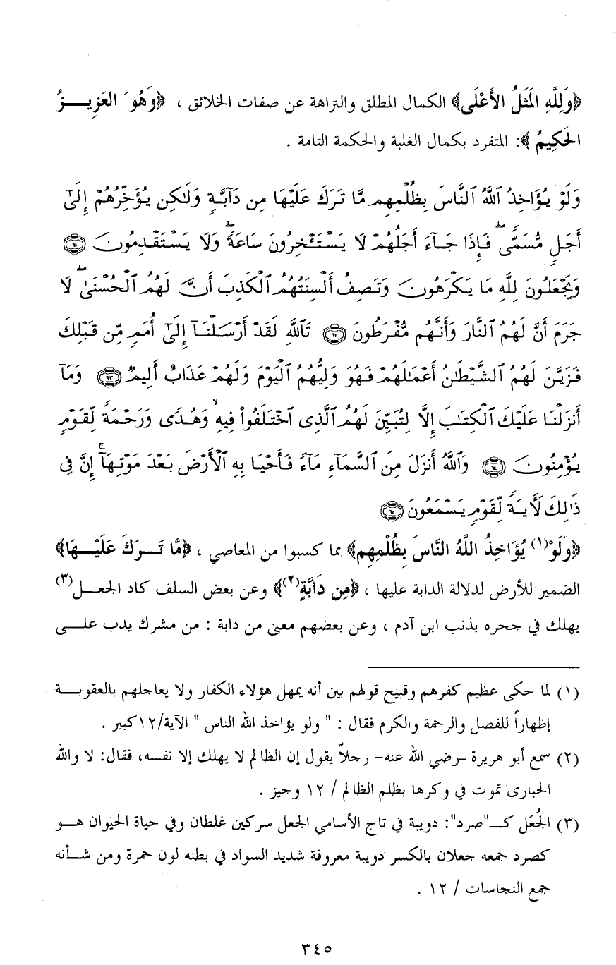 (وَلَوْ يُؤَاخِذُ اللهُ النَّاسَ بِظُلْمِهِمْ مَا تَرَكَ عَلَيْهَا مِنْ دَابَّةٍ وَلَكِنْ يُؤَخِّرُهُمْ إِلَى أَجَلٍ مُسَمًّى فَإِذَا جَاءَ أَجَلُهُمْ لَا يَسْتَأْخِرُونَ سَاعَةً وَلَا يَسْتَقْدِمُونَ (61) وَيَجْعَلُونَ لله مَا يَكْرَهُونَ وَتَصِفُ أَلْسِنَتُهُمُ الْكَذِبَ أَنَّ لَهُمُ الْحُسْنَى لَا جَرَمَ أَنَّ لَهُمُ النَّارَ وَأَنَّهُمْ مُفْرَطُونَ (62) تَاللهِ لَقَدْ أَرْسَلْنَا إِلَى أُمَمٍ مِنْ قَبْلِكَ فَزَيَّنَ لَهُمُ الشَّيْطَانُ أَعْمَالَهُمْ فَهُوَ وَلِيُّهُمُ الْيَوْمَ وَلَهُمْ عَذَابٌ أَلِيمٌ (63) وَمَا أَنْزَلْنَا عَلَيْكَ الْكِتَابَ إِلَّا لِتُبَيِّنَ لَهُمُ الَّذِي اخْتَلَفُوا فِيهِ وَهُدًى وَرَحْمَةً لِقَوْمٍ يُؤْمِنُونَ (64) وَاللهُ أَنْزَلَ مِنَ السَّمَاءِ مَاءً فَأَحْيَا بِهِ الْأَرْضَ بَعْدَ مَوْتِهَا إِنَّ فِي ذَلِكَ لَآيَةً لِقَوْمٍ يَسْمَعُونَ (65)