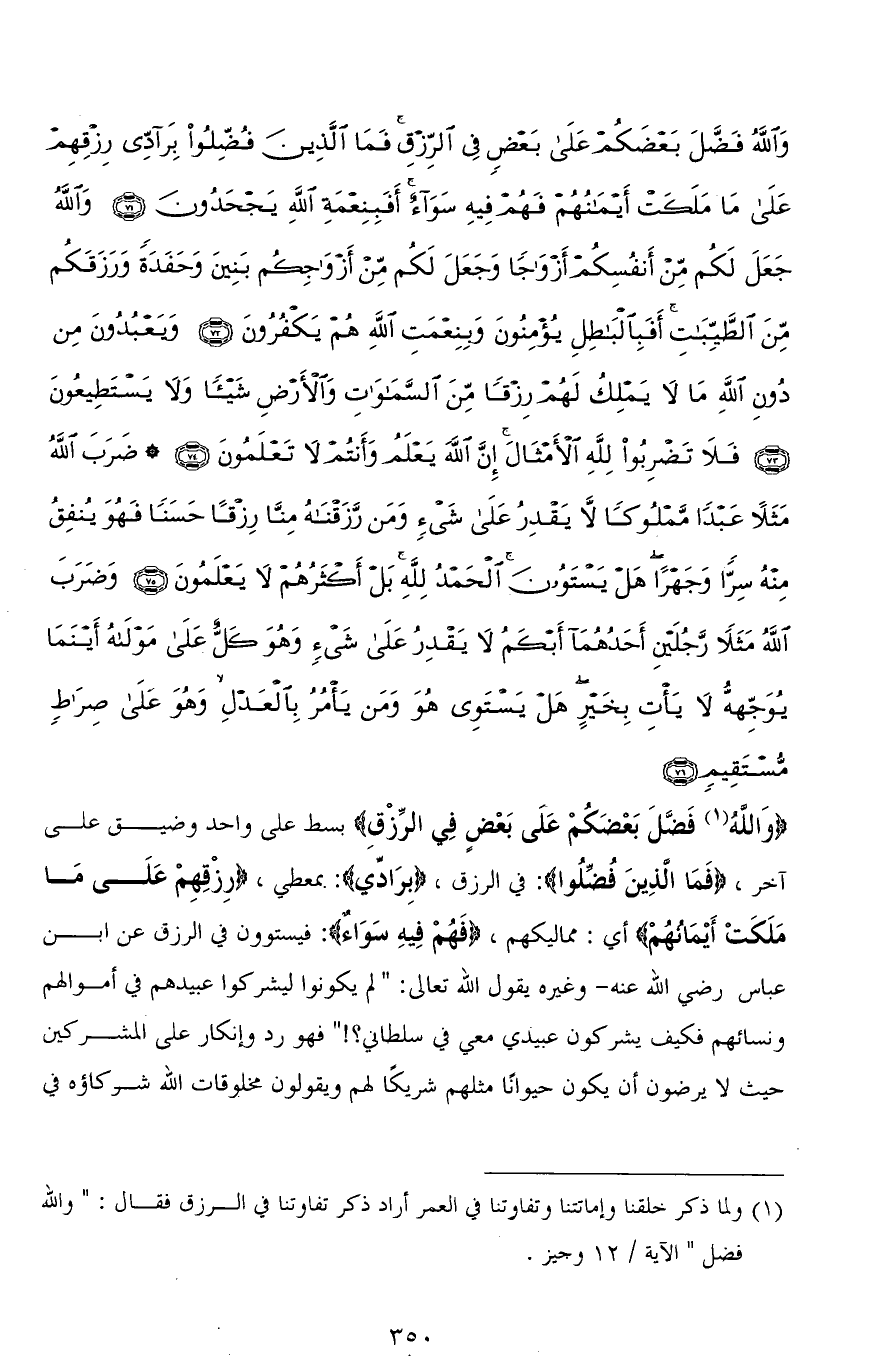 (وَاللهُ فَضَّلَ بَعْضَكُمْ عَلَى بَعْضٍ فِي الرِّزْقِ فَمَا الَّذِينَ فُضِّلُوا بِرَادِّي رِزْقِهِمْ عَلَى مَا مَلَكَتْ أَيْمَانُهُمْ فَهُمْ فِيهِ سَوَاءٌ أَفَبِنِعْمَةِ اللهِ يَجْحَدُونَ (71) وَاللهُ جَعَلَ لَكُمْ مِنْ أَنْفُسِكُمْ أَزْوَاجًا وَجَعَلَ لَكُمْ مِنْ أَزْوَاجِكُمْ بَنِينَ وَحَفَدَةً وَرَزَقَكُمْ مِنَ الطَّيِّبَاتِ أَفَبِالْبَاطِلِ يُؤْمِنُونَ وَبِنِعْمَتِ اللهِ هُمْ يَكْفُرُونَ (72) وَيَعْبُدُونَ مِنْ دُونِ اللهِ مَا لَا يَمْلِكُ لَهُمْ رِزْقًا مِنَ السَّمَاوَاتِ وَالْأَرْضِ شَيْئًا وَلَا يَسْتَطِيعُونَ (73) فَلَا تَضْرِبُوا لله الْأَمْثَالَ إِنَّ اللهَ يَعْلَمُ وَأَنْتُمْ لَا تَعْلَمُونَ (74) ضَرَبَ اللهُ مَثَلًا عَبْدًا مَمْلُوكًا لَا يَقْدِرُ عَلَى شَيْءٍ وَمَنْ رَزَقْنَاهُ مِنَّا رِزْقًا حَسَنًا فَهُوَ يُنْفِقُ مِنْهُ سِرًّا وَجَهْرًا هَلْ يَسْتَوُونَ الْحَمْدُ لله بَلْ أَكْثَرُهُمْ لَا يَعْلَمُونَ (75) وَضَرَبَ اللهُ مَثَلًا رَجُلَيْنِ أَحَدُهُمَا أَبْكَمُ لَا يَقْدِرُ عَلَى شَيْءٍ وَهُوَ كَلٌّ عَلَى مَوْلَاهُ أَيْنَمَا يُوَجِّهْهُ لَا يَأْتِ بِخَيْرٍ هَلْ يَسْتَوِي هُوَ وَمَنْ يَأْمُرُ بِالْعَدْلِ وَهُوَ عَلَى صِرَاطٍ مُسْتَقِيمٍ (76)