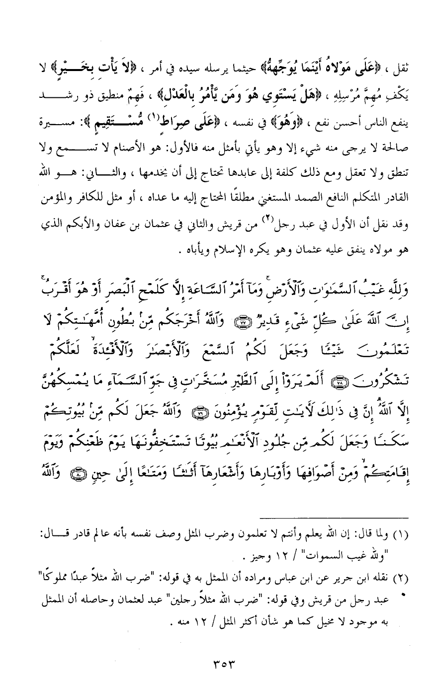 ثقل، (عَلَى مَوْلَاهُ أَيْنَمَا يُوَجِّهْهُ) حيثما يرسله سيده في أمر، (لاَ يَأْتِ بِخَيْرٍ) لا يَكْفِ مُهمَّ مُرْسِلِهِ، (هَلْ يَسْتَوِي هُوَ وَمَنْ يَأْمُرُ بِالْعَدْلِ)، فَهِمٌ منطيق ذو رشد ينفع الناس أحسن نفع، (وَهُوَ) في نفسه، (عَلَى صِرَاطٍ مُّسْتَقِيمٍ): مسيرة صالحة لا يرجى منه شيء إلا وهو يأتي بأمثل منه فالأول: هو الأصنام لا تسمع ولا تنطق ولا تعقل ومع ذلك كلفة إلى عابدها تحتاج إلى أن يخدمها، والثاني: هو الله القادر المتكلم النافع الصمد المستغني مطلقًا المحتاج إليه ما عداه، أو مثل للكافر والمؤمن وقد نقل أن الأول في عبد رجل من قريش والثاني في عثمان بن عفان والأبكم الذي هو مولاه ينفق عليه عثمان وهو يكره الإسلام ويأباه.
