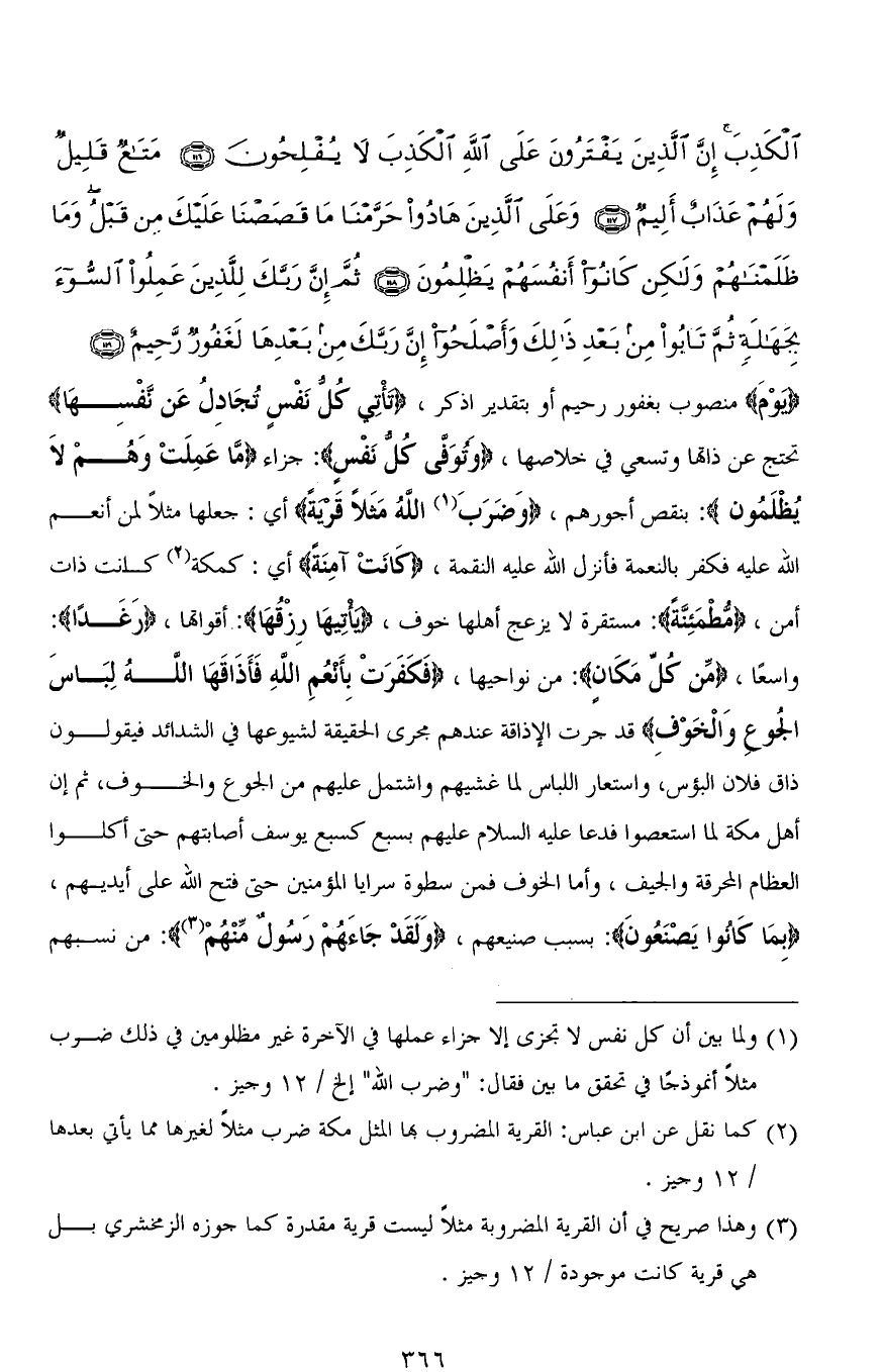 (يوْمَ) منصوب بـ غفور رحيم أو بتقدير اذكر، (تَأْتِي كُلُّ نَفْسٍ تُجَادِلُ عَنْ نَفْسِهَا) تحتج عن ذاتها وتسعي في خلاصها، (وَتُوَفَّى كُلُّ نَفْسٍ)،: جزاء (مَّا عَمِلَتْ وَهُمْ لاَ يُظْلَمُون): بنقص أجورهم، (وَضَرَبَ اللهُ مَثَلًا قَرْيَةً) أي: جعلها مثلاً لمن أنعم الله عليه فكفر بالنعمة فأنزل الله عليه النقمة، (كَانَتْ آمِنَةً) أي: كـ مكة كانت ذات أمن، (مُطْمَئِنَّةً): مستقرة لا يزعج أهلها خوف، (يَأْتِيهَا رِزْقُهَا): أقواتها، (رَغَدًا): واسعًا، (مِنْ كُلِّ مَكَانٍ): من نواحيها، (فَكَفَرَتْ بِأَنْعُمِ اللهِ فَأَذَاقَهَا اللهُ لِبَاسَ الْجُوعِ وَالْخَوْفِ) قد جرت الإذاقة عندهم مجرى الحقيقة لشيوعها في الشدائد فيقولون ذاق فلان البؤس، واستعار اللباس لما غشيهم واشتمل عليهم من الجوع والخوف، ثم إن أهل مكة لما استعصوا فدعا عليه السلام عليهم بسبع كسبع يوسف أصابتهم حتى أكلوا العظام المحرقة والجيف، وأما الخوف فمن سطوة سرايا المؤمنين حتى فتح الله على أيديهم، (بِمَا كَانُوا يَصْنَعُونَ): بسبب صنيعهم، (وَلَقَدْ جَاءَهُمْ رَسُولٌ مِنْهُمْ): من نسبهم