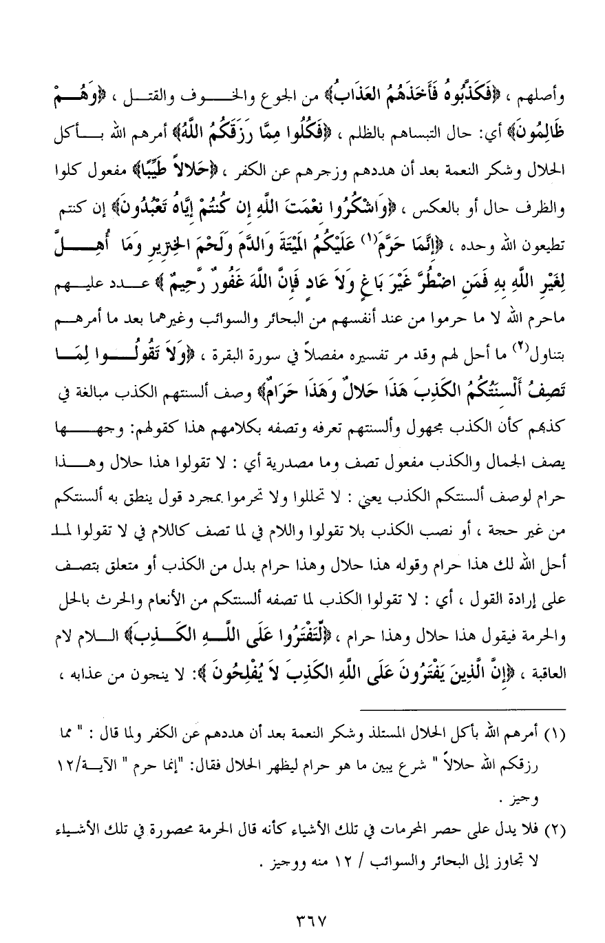 وأصلهم، (فَكَذبُوهُ فَأَخَذَهُمُ العَذَابُ) من الجوع والخوف والقتل، (وَهُم ظَالِمُونَ) أي: حال التبساهم بالظلم، (فَكُلُوا مِمَّا رَزَقَكُمُ اللهُ) أمرهم الله بأكل الحلال وشكر النعمة بعد أن هددهم وزجرهم عن الكفر، (حَلالاً طَيِّبًا) مفعول كلوا والظرف حال أو بالعكس، (وَاشْكرُوا نِعْمَتَ اللهِ إِن كنتُمْ إِيَّاهُ تَعبدُونَ) إن كنتم تطيعون الله وحده، (إِنَّمَا حَرَّمَ عَلَيْكُمُ الْمَيْتَةَ وَالدَّمَ وَلَحْمَ الْخِنْزِيرِ وَمَا أُهِلَّ لِغَيْرِ اللهِ بِهِ فَمَنِ اضْطُرَّ غَيْرَ بَاغٍ وَلَا عَادٍ فَإِنَّ اللهَ غَفُورٌ رَحِيمٌ) عدد عليهم ما حرم الله لا ما حرموا من عند أنفسهم من البحائر والسوائب وغيرهما بعد ما أمرهم بتناول ما أحل لهم وقد مر تفسيره مفصلاً في سورة البقرة، (وَلَا تَقُولُوا لِمَا تَصِفُ أَلْسِنَتُكُمُ الْكَذِبَ هَذَا حَلَالٌ وَهَذَا حَرَامٌ) وصف ألسنتهم الكذب مبالغة في كذبهم كأن الكذب مجهول وألسنتهم تعرفه وتصفه بكلامهم هذا كقولهم: وجهها يصف الجمال والكذب مفعول تصف وما مصدرية أي: لا تقولوا هذا حلال وهذا حرام لوصف ألسنتكم الكذب يعني: لا تحللوا ولا تحرموا بمجرد قول ينطق به ألسنتكم من غير حجة، أو نصب الكذب بـ لا تقولوا واللام في لما تصف كاللام في لا تقولوا لما أحل الله لك هذا حرام وقوله هذا حلال وهذا حرام بدل من الكذب أو متعلق بـ تصف على إرادة القول، أي: لا تقولوا الكذب لما تصفه ألسنتكم من الأنعام والحرث بالحل والحرمة فيقول هذا حلال وهذا حرام، (لِّتَفْتَرُوا عَلَى اللهِ الكَذِبَ) اللام لام العاقبة، (إِنَّ الَّذِينَ يَفْتَرُونَ عَلَى اللهِ الكَذِبَ لاَ يُفْلِحُونَ): لا ينجون من عذابه،
