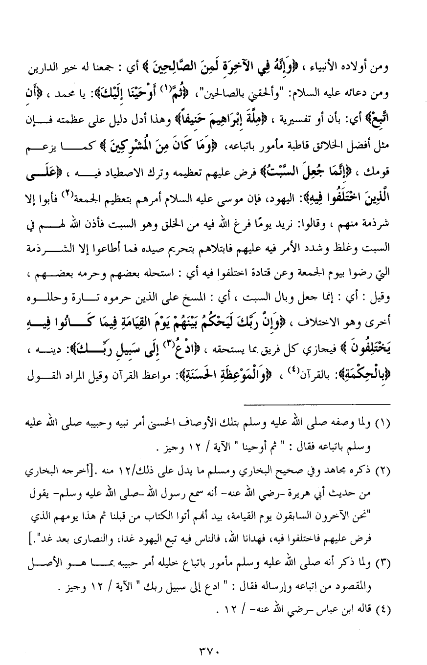 ومن أولاده الأنبياء، (وَإِنَّهُ فِي الْآخِرَةِ لَمِنَ الصَّالِحِينَ): جمعنا له خير الدارين ومن دعائه عليه السلام: (وألحقني بالصالحين) (ثُمَّ أَوْحَيْنَا إِلَيْكَ): يا محمد، (أَنِ اتَّبِعْ) أي: بأن أو تفسيرية، (مِلَّةَ إِبْرَاهِيمَ حَنِيفًا) وهذا أدل دليل على عظمته فإن مثل أفضل الخلائق قاطبة مأمور باتباعه، (وَمَا كَانَ مِنَ المُشْرِكِينَ) كما يزعم قومك، (إِنَّمَا جُعِلَ السَّبْتُ) فرض عليهم تعظيمه وترك الاصطياد فيه (عَلَى الَّذِينَ اخْتَلَفُوا فِيهِ): اليهود، فإن موسى عليه السلام أمرهم بتعظيم الجمعة فأبوا إلا شرذمة منهم، وقالوا: نريد يومًا فرغ الله فيه من الخلق وهو السبت فأذن الله لهم في السبت وغلظ وشدد الأمر فيه عليهم فابتلاهم بتحريم صيده فما أطاعوا إلا الشرذمة التي رضوا بيوم الجمعة وعن قتادة اختلفوا فيه أي: استحله بعضهم وحرمه بعضهم، وقيل: أي: إنما جعل وبال السبت، أي: المسخ على الذين حرموه تارة وحللوه أخرى وهو الاختلاف، (وَإِنَّ رَبَّكَ لَيَحْكُمُ بَيْنَهُمْ يَوْمَ الْقِيَامَةِ فِيمَا كَانُوا فِيهِ يَخْتَلِفُونَ) فيجازي كل فريق بما يستحقه، (ادْعُ إِلَى سَبِيلِ ربِّكَ): دينه، (بِالْحِكْمَةِ): بالقرآن، (وَالْمَوْعِظَةِ الحَسَنَةِ): مواعظ القرآن وقيل المراد القول