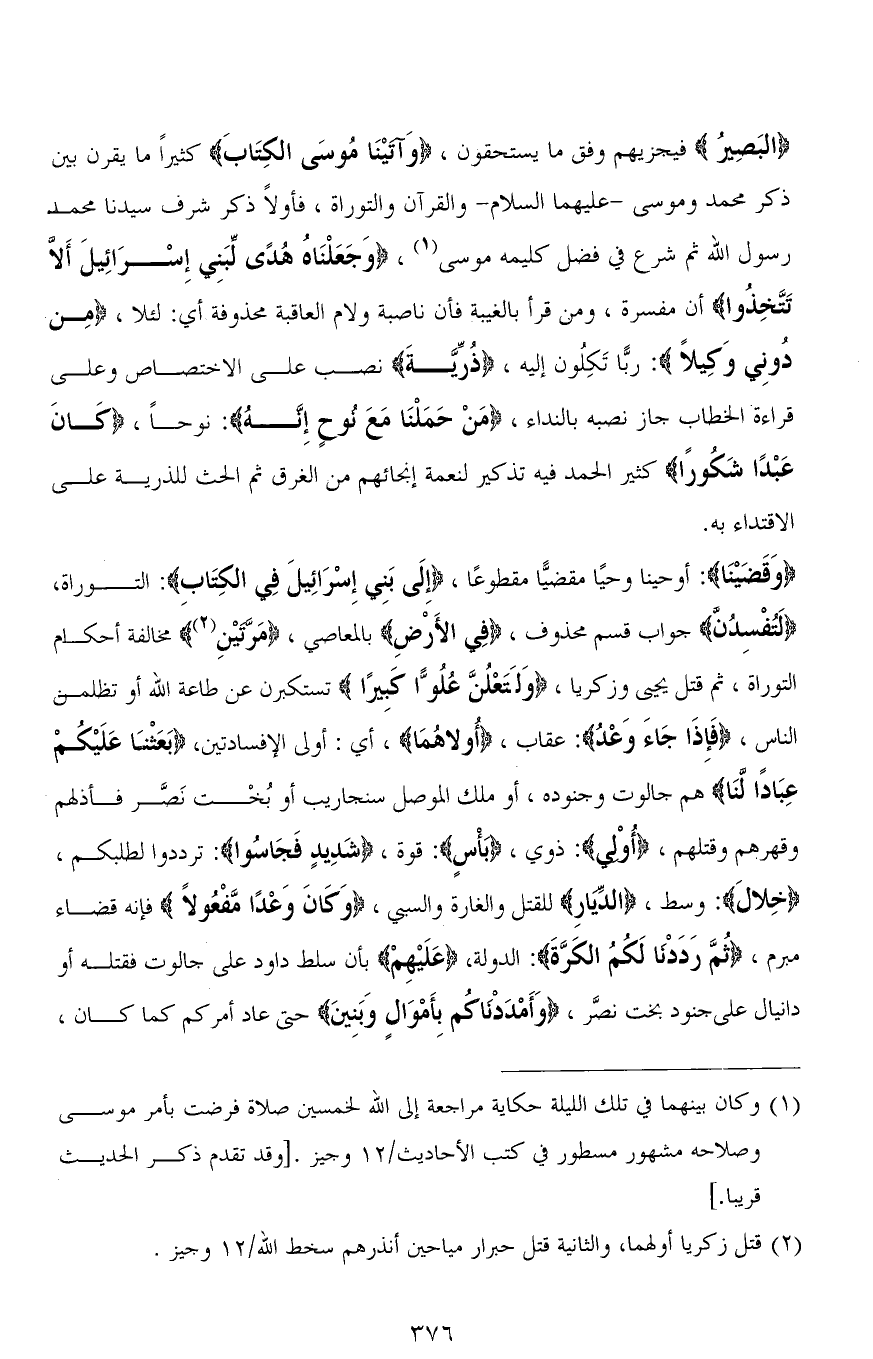 (وَقَضَيْنَا): أوحينا وحيًا مقضيًّا مقطوعًا، (إِلَى بَنِي إِسْرَائِيلَ فِي الكِتَابِ): التوراة، (لَتُفْسِدُنَّ) جواب قسم محذوف، (فِي الْأَرْضِ) بالمعاصي، (مَرتيْنِ) مخالفة أحكام التوراة، ثم قتل يحيى وزكريا، (وَلَتَعْلُنَّ عُلُوًّا كَبِيرًا) تستكبرن عن طاعة الله أو تظلمن الناس، (فَإِذَا جَاءَ وَعْدُ): عقاب، (أُولَاهُمَا)، أي: أولى الإفسادتين، (بَبَعَثْنَا عَلَيْكُمْ عِبَادًا لَنَا) هم جالوت وجنوده، أو ملك الموصل سنجاريب أو بُخْت نَصَّر فأذلهم وقهرهم وقتلهم، (أُولِي): ذوي، (بَأْسٍ): قوة، (شَدِيدٍ فَجَاسُوا): ترددوا لطلبكم، (خِلَالَ): وسط، (الدِّيَارِ) للقتل والغارة والسبي، (وَكَانَ وَعْدًا مَّفْعُولاً) فإنه قضاء مبرم، (ثُمَّ رَدَدْنا لَكُمُ الكَرَّةَ): الدولة، (عَلَيْهِمْ) بأن سلط داود على جالوت فقتله أو دانيال على جنود بخت نصَّر، (وَأَمْدَدْناكُم بِأَمْوَالٍ وَبَنِينَ) حتى عاد أمركم كما كان،