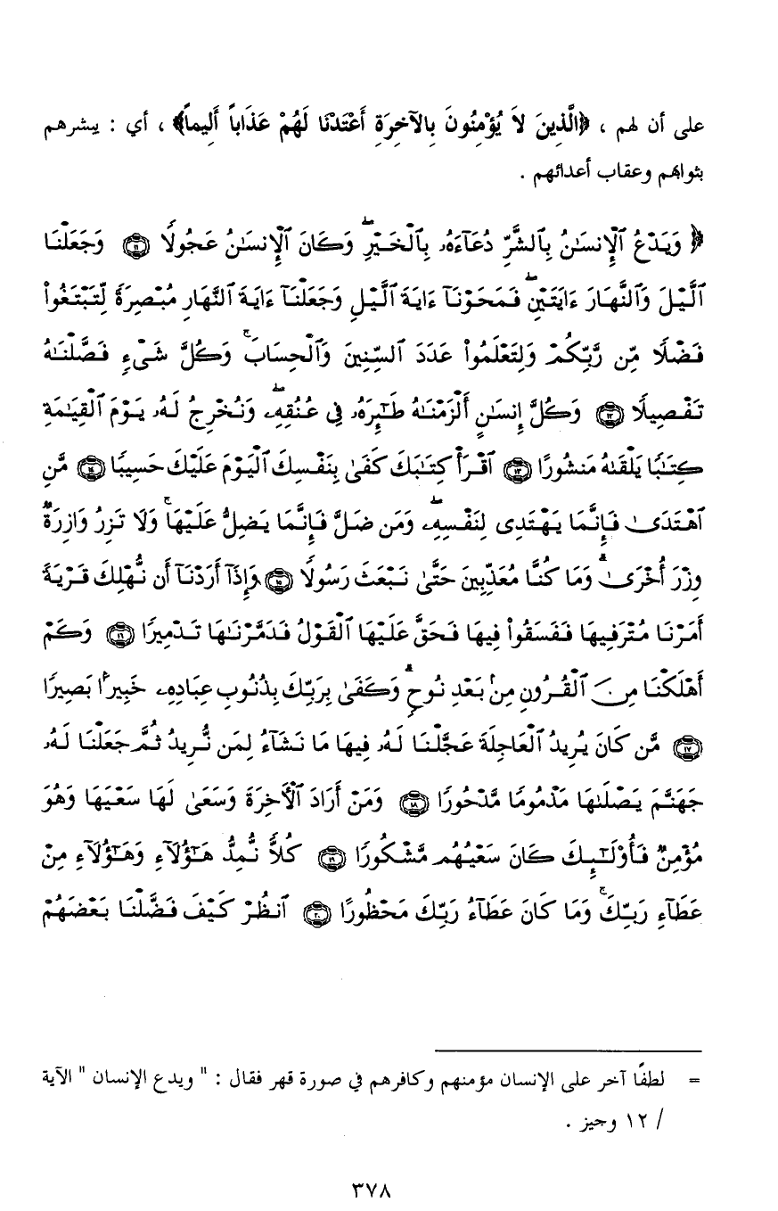 (وَيَدْعُ الْإِنْسَانُ بِالشَّرِّ دُعَاءَهُ بِالْخَيْرِ وَكَانَ الْإِنْسَانُ عَجُولًا (11) وَجَعَلْنَا اللَّيْلَ وَالنَّهَارَ آيَتَيْنِ فَمَحَوْنَا آيَةَ اللَّيْلِ وَجَعَلْنَا آيَةَ النَّهَارِ مُبْصِرَةً لِتَبْتَغُوا فَضْلًا مِنْ رَبِّكُمْ وَلِتَعْلَمُوا عَدَدَ السِّنِينَ وَالْحِسَابَ وَكُلَّ شَيْءٍ فَصَّلْنَاهُ تَفْصِيلًا (12) وَكُلَّ إِنْسَانٍ أَلْزَمْنَاهُ طَائِرَهُ فِي عُنُقِهِ وَنُخْرِجُ لَهُ يَوْمَ الْقِيَامَةِ كِتَابًا يَلْقَاهُ مَنْشُورًا (13) اقْرَأْ كِتَابَكَ كَفَى بِنَفْسِكَ الْيَوْمَ عَلَيْكَ حَسِيبًا (14) مَنِ اهْتَدَى فَإِنَّمَا يَهْتَدِي لِنَفْسِهِ وَمَنْ ضَلَّ فَإِنَّمَا يَضِلُّ عَلَيْهَا وَلَا تَزِرُ وَازِرَةٌ وِزْرَ أُخْرَى وَمَا كُنَّا مُعَذِّبِينَ حَتَّى نَبْعَثَ رَسُولًا (15) وَإِذَا أَرَدْنَا أَنْ نُهْلِكَ قَرْيَةً أَمَرْنَا مُتْرَفِيهَا فَفَسَقُوا فِيهَا فَحَقَّ عَلَيْهَا الْقَوْلُ فَدَمَّرْنَاهَا تَدْمِيرًا (16) وَكَمْ أَهْلَكْنَا مِنَ الْقُرُونِ مِنْ بَعْدِ نُوحٍ وَكَفَى بِرَبِّكَ بِذُنُوبِ عِبَادِهِ خَبِيرًا بَصِيرًا (17) مَنْ كَانَ يُرِيدُ الْعَاجِلَةَ عَجَّلْنَا لَهُ فِيهَا مَا نَشَاءُ لِمَنْ نُرِيدُ ثُمَّ جَعَلْنَا لَهُ جَهَنَّمَ يَصْلَاهَا مَذْمُومًا مَدْحُورًا (18) وَمَنْ أَرَادَ الْآخِرَةَ وَسَعَى لَهَا سَعْيَهَا وَهُوَ مُؤْمِنٌ فَأُولَئِكَ كَانَ سَعْيُهُمْ مَشْكُورًا (19) كُلًّا نُمِدُّ هَؤُلَاءِ وَهَؤُلَاءِ مِنْ عَطَاءِ رَبِّكَ وَمَا كَانَ عَطَاءُ رَبِّكَ مَحْظُورًا (20) انْظُرْ كَيْفَ فَضَّلْنَا بَعْضَهُمْ