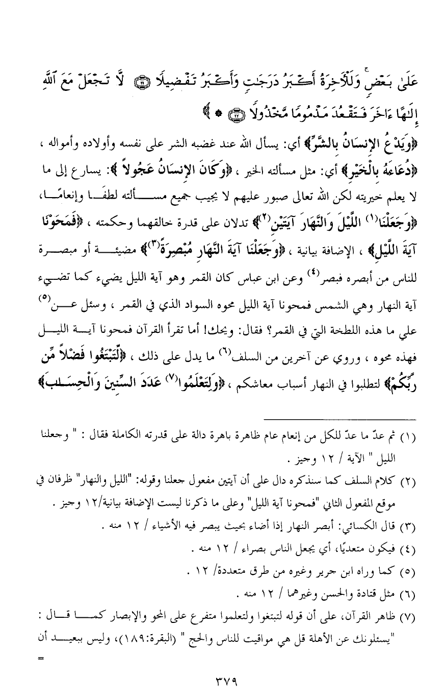 (وَيَدْعُ الإِنسَانْ بِالشَّرِّ) أي: يسأل الله عند غضبه الشر على نفسه وأولاده وأمواله، (دُعَاءَهُ بِالْخَيْرِ) أي: مثل مسألته الخير، (وَكَانَ الْإِنْسَانُ عَجُولًا): يسارع إلى ما لا يعلم خيريته لكن الله تعالى صبور عليهم لا يجيب جميع مسألته لطفًا وإنعامًا، (وَجَعَلْنَا اللَّيْلَ وَالنَّهَارَ آيَتَيْنِ) تدلان على قدرة خالقهما وحكمته، (فَمَحَوْنَا آيَةَ اللَّيْلِ)، الإضافة بيانية، (وَجَعَلْنَا آيَةَ النَّهَارِ مُبْصِرَةً) مضيئة أو مبصرة للناس من أبصره فبصر وعن ابن عباس كان القمر وهو آية الليل يضيء كما تضيء آية النهار وهي الشمس فمحونا آية الليل محوه السواد الذي في القمر، وسئل عن على ما هذه اللطخة التي في القمر؟ فقال: ويحك! أما تقرأ القرآن فمحونا آية الليل فهذه محوه، وروي عن آخرين من السلف ما يدل على ذلك، (لِتَبْتَغُوا فَضْلًا مِنْ رَبِّكُمْ) لتطلبوا في النهار أسباب معاشكم، (وَلِتَعْلَمُوا عَدَدَ السِّنِينَ وَالْحِسَابَ)