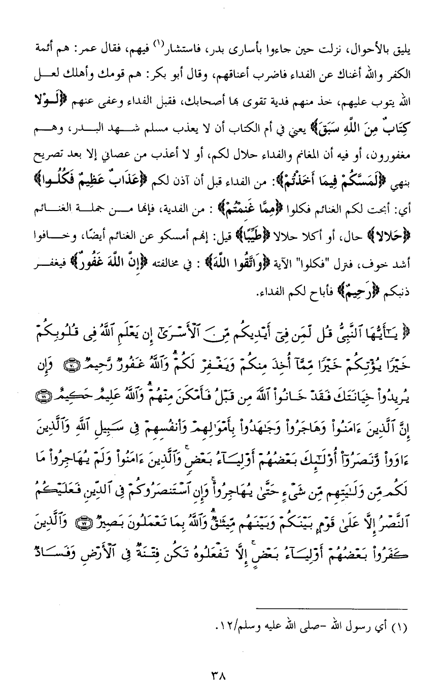 (يَا أَيُّهَا النَّبِيُّ قُلْ لِمَنْ فِي أَيْدِيكُمْ مِنَ الْأَسْرَى إِنْ يَعْلَمِ اللهُ فِي قُلُوبِكُمْ خَيْرًا يُؤْتِكُمْ خَيْرًا مِمَّا أُخِذَ مِنْكُمْ وَيَغْفِرْ لَكُمْ وَاللهُ غَفُورٌ رَحِيمٌ (70) وَإِنْ يُرِيدُوا خِيَانَتَكَ فَقَدْ خَانُوا اللهَ مِنْ قَبْلُ فَأَمْكَنَ مِنْهُمْ وَاللهُ عَلِيمٌ حَكِيمٌ (71) إِنَّ الَّذِينَ آمَنُوا وَهَاجَرُوا وَجَاهَدُوا بِأَمْوَالِهِمْ وَأَنْفُسِهِمْ فِي سَبِيلِ اللهِ وَالَّذِينَ آوَوْا وَنَصَرُوا أُولَئِكَ بَعْضُهُمْ أَوْلِيَاءُ بَعْضٍ وَالَّذِينَ آمَنُوا وَلَمْ يُهَاجِرُوا مَا لَكُمْ مِنْ وَلَايَتِهِمْ مِنْ شَيْءٍ حَتَّى يُهَاجِرُوا وَإِنِ اسْتَنْصَرُوكُمْ فِي الدِّينِ فَعَلَيْكُمُ النَّصْرُ إِلَّا عَلَى قَوْمٍ بَيْنَكُمْ وَبَيْنَهُمْ مِيثَاقٌ وَاللهُ بِمَا تَعْمَلُونَ بَصِيرٌ (72) وَالَّذِينَ كَفَرُوا بَعْضُهُمْ أَوْلِيَاءُ بَعْضٍ إِلَّا تَفْعَلُوهُ تَكُنْ فِتْنَةٌ فِي الْأَرْضِ وَفَسَادٌ كَبِيرٌ (73)