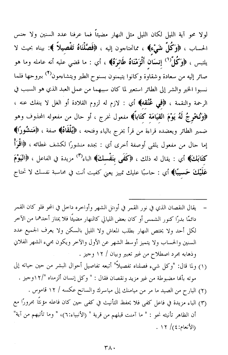 لولا محو آية الليل لكان الليل مثل النهار مضيئًا فما عرفنا عدد السنين ولا جنس الحساب، (وَكُل شَيْءٍ) مما تحتاجون إليه، (فَصَّلْنَاهُ تَفْصِيلًا): بيناه بحيث لا يلتبس، (وَكُلَّ إِنْسَانٍ أَلْزَمْنَاهُ طَائِرَهُ) أي: ما قضي عليه أنه عامله وما هو صائر إليه من سعادة وشقاوة وكانوا يتيمنون بسنوح الطير ويتشاءمون ببروحها فلما نسبوا الخير والشر إلى الطائر استعير لما كان سببهما من عمل العبد الذي هو السبب في الرحمة والنقمة، (فِي عُنُقِهِ) أي: لازم له لزوم القلادة أو الغل لا ينفك عنه، (وَنُخْرِجُ لَهُ يَوْمَ الْقِيَامَةِ كِتَابًا) مفعول نخرج، أو حال من مفعوله المحذوف وهو ضمير الطائر ويعضده قراءة من قرأ يخرج بالياء وفتحه، (يَلْقَاهُ) صفة، (مَنْشُورًا) إما حال من مفعول يلقى أو صفة أخرى أي: يجده منشورًا لكشف غطائه، (اقْرَأ كِتَابَكَ) أي: يقال له ذلك، (كَفَى بِنَفْسِكَ) الباء مزيدة في الفاعل، (اليَوْمَ عَلَيْكَ حَسِيبًا) أي: حاسبًا عليك تمييز يعني كفيت أنت في محاسبة نفسك لا تحتاج