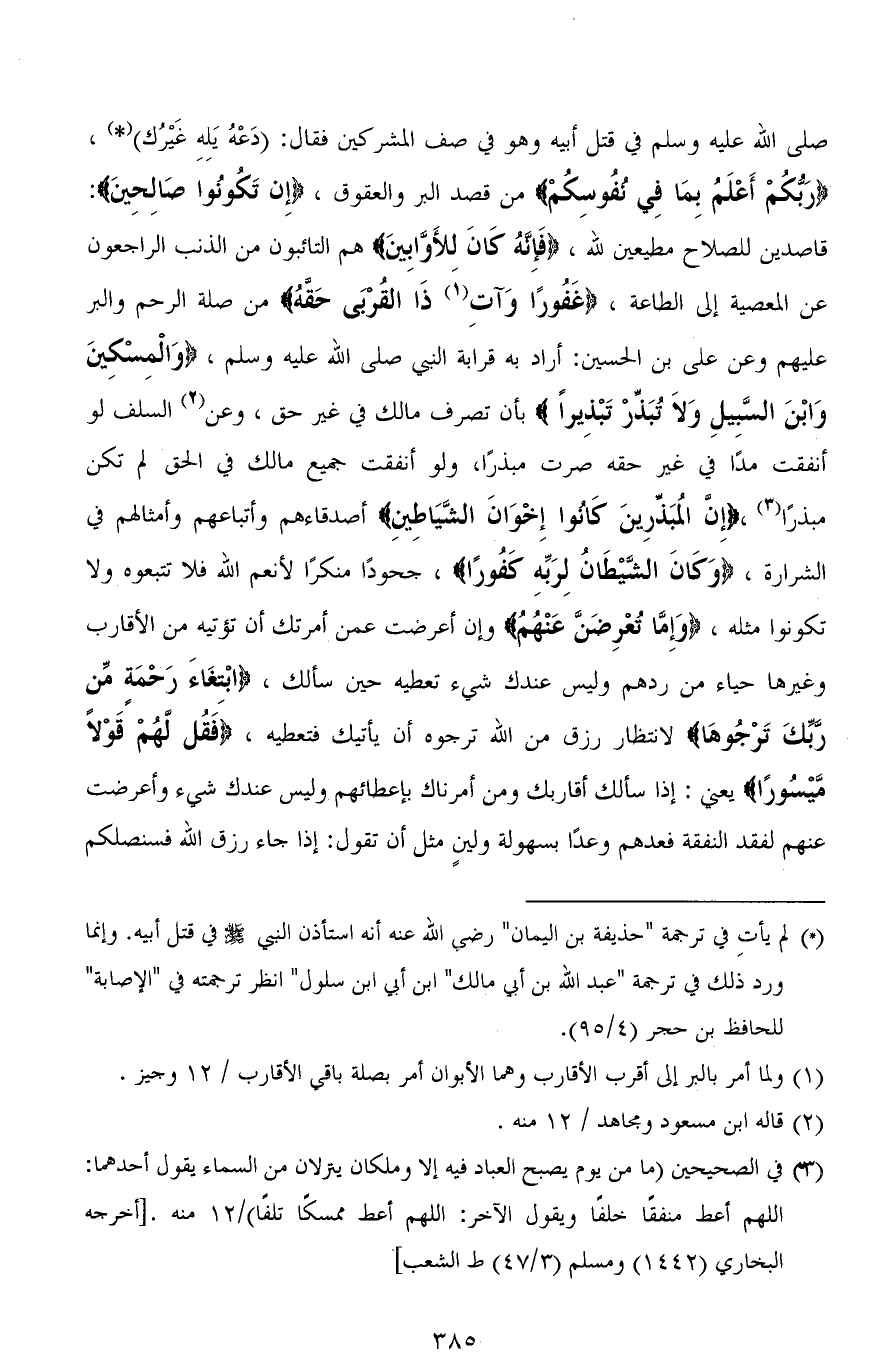 في قتل أبيه وهو في صفِّ المشركين فقال: (دَعْهُ يَلِهِ غَيْرُك)، (رَبُّكُمْ أَعْلَمُ بِمَا فِي نُفُوسِكمْ) من قصد البر والعقوق، (إِن تَكُونوا صَالِحِينَ): قاصدين للصلاح مطعين لله، (فَإِنَّهُ كَانَ لِلْأَوَّابِينَ) هم التائبون من الذنب الراجعون عن المعصية إلى الطاعة، (غَفُورًا (25) وَآتِ ذَا الْقُرْبَى حَقَّهُ) من صلة الرحم والبر عليهم وعن علي بن الحسين: أراد به قرابة النبي صلى الله عليه وسلم، (وَالْمِسْكِينَ وَابْنَ السَّبِيلِ وَلَا تُبَذِّرْ تَبْذِيرًا) بأن تصرف مالك في غير حق، وعن السلف لو أنفقت مُدًّا في غير حقه صرت مبذرًا، ولو أنفقت جميع مالك في الحق لم تكن مبذرًا، (إِنَّ الْمُبَذِّرِينَ كَانُوا إِخْوَانَ الشَّيَاطِينِ) أصدقاءهم وأتباعهم وأمثالهم في الشرارة، (وَكَانَ الشَّيْطَانُ لِرَبِّهِ كَفُورًا)، جحودًا منكرًا لأنعم الله فلا تتبعوه ولا تكونوا مثله، (وَإِمَّا تعْرِضَنَّ عَنْهم) وإن أعرضت عمن أمرتك أن تؤتيه من الأقارب وغيرها حياء من ردهم وليس عندك شيء تعطيه حين سألك، (ابْتِغَاءَ رَحْمَةٍ مِنْ رَبِّكَ تَرْجُوهَا) لانتظار رزق من الله ترجوه أن يأتيك فتعطه، (فَقُلْ لَهُمْ قَوْلًا مَيْسُورًا) يعني: إذا سألك أقاربك ومن أمرناك بإعطائهم وليس عندك شيء وأعرضت عنهم لفقد النفقة فعدهم وعدًا بسهولة ولينٍ مثل أن تقول: إذا جاء رزق الله فسنصلكم