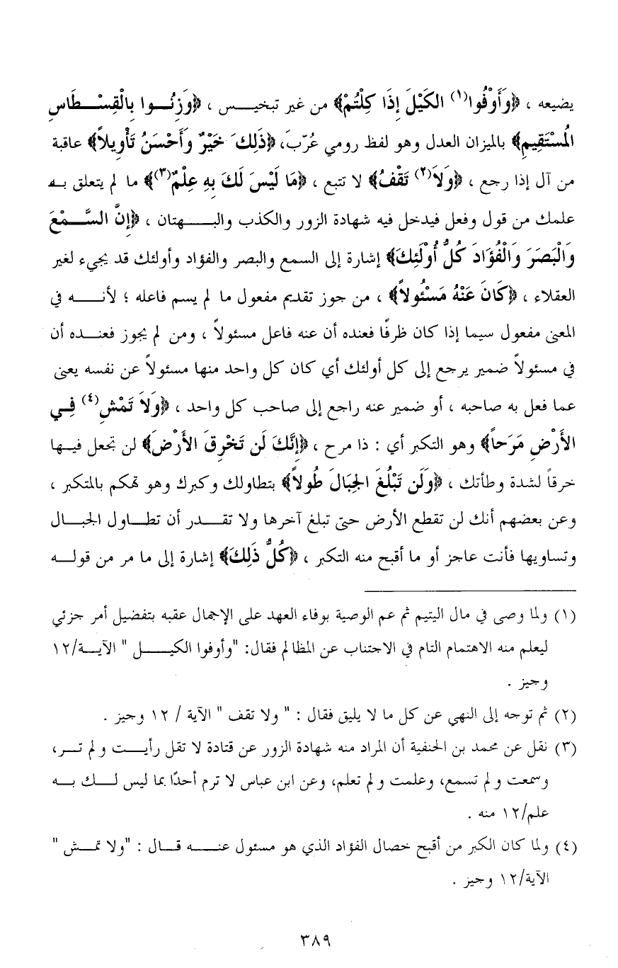 يضيعه، (وَأَوْفُوا الكَيْلَ إِذَا كِلْتُمْ) من غير تبخيس، (وَزِنُوا بِالْقِسْطَاسِ الْمُسْتَقِيمِ) بالميزان العدل وهو لفظ رومي عُرِّبَ، (ذلِكَ خَيْرٌ وَأَحْسَنُ تَأوِيلاً) عاقبة من آل إذا رجع، (وَلاَ تَقْفُ) لا تتبع، (مَا لَيْسَ لَكَ بِهِ عِلْمٌ) ما لم يتعلق به علمك من قول وفعل فيدخل فيه شهادة الزور والكذب والبهتان، (إِنَّ السَّمْعَ وَالْبَصَرَ وَالْفُؤَادَ كل أُوْلَئِكَ) إشارة إلى السمع والبصر والفؤاد وأولئك قد يجيء لغير العقلاء، (كَانَ عَنْهُ مَسْئُولًا)، من جوز تقديم مفعول ما لم يسم فاعله؛ لأنه في المعنى مفعول سيما إذا كان ظرفًا فعنده أن عنه فاعل مسئولاً، ومن لم يجوز فعنده أن في مسئولاَّ ضَمير يرجع إلى كل أولئك أي كان كل واحد منها مسئولاَّ عَن نفسه يعني عما فعل به صاحبه، أو ضمير عنه راجع إلى صاحب كل واحد، (وَلَا تَمْشِ فِي الْأَرْضِ مَرَحًا) وهو التكبر أي: ذا مرح، (إِنَّكَ لَنْ تَخْرِقَ الْأَرْضَ) لن تجعل فيها خرقًا لشدة وطأتك، (وَلَنْ تَبْلُغَ الْجِبَالَ طُولًا) بتطاولك وكبرك وهو تهكم بالمتكبر، وعن بعضهم إنك لن تقطع الأرض حتى تبلغ آخرها ولا تقدر أن تطاول الجبال وتساويها فأنت عاجز أو ما أقبح منه التكبر، (كل ذَلِكَ) إشارة إلى ما مر من قوله