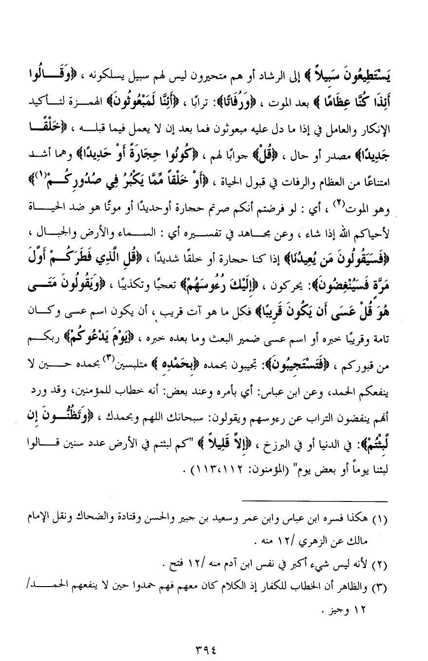 يَسْتَطِيعُونَ سَبِيلًا) إلى الرشاد أو هم متحيرون ليس لهم سبيل يسلكونه، (وَقَالُوا أَإِذَا كُنَّا عِظَامًا) بعد الموت، (وَرُفَاتًا): ترابًا، (أَإِنَّا لَمَبْعُوثُونَ) الهمزة لتأكيد الإنكار والعامل في إذا ما دل عليه مبعوثون فما بعد إن لا يعمل فيما قبله، (خَلْقًا جَدِيدًا) مصدر أو حال، (قُلْ) جوابا لهم، (كُونوا حِجَارَةً أَوْ حَدِيدًا) وهما أشد امتناعًا من العظام والرفات في قبول الحياة، (أَوْ خَلْقًا مِّمَّا يَكْبُرُ فِي صُدُورِكُمْ) وهو الموت، أي: لو فرضتم أنكم صرتم حجارة أو حديدًا أو موتًا هو ضد الحياة لأحياكم الله إذا شاء، وعن مجاهد في تفسيره أي: السماء والأرض والجبال، (فَسَيَقُولُونَ مَن يُعِيدُنا) إذا كنا حجارة أو خلقًا شديدًا، (قُلِ الَّذِي فَطَرَكُمْ أَولَ مَرَّةٍ فَسَيُنْغِضُونَ): يحركون، (إِلَيْكَ رُءوسَهُمْ) تعجبًا وتكذيبًا، (وَيَقُولُونَ مَتَى هُوَ قُلْ عَسَى أَن يَكُونَ قَرِيبًا) فكل ما هو آت قريب، أن يكون اسم عسى وكان تامة وقريبًا خبره أو اسم عسى ضمير البعث وما بعده خبره، (يَوْمَ يَدْعُوكُمْ) ربكم من قبوركم، (فتسْتَجِيبُونَ): تجيبون بحمده (بِحَمْدِهِ) متلبسين بحمده حين لا ينفعكم الحمد، وعن ابن عباس: أي بأمره وعند بعض: أنه خطاب للمؤمنين، وقد ورد أنهم ينفضون التراب عن رءوسهم ويقولون: سبحانك اللهم وبحمدك، (وَتَظُنُّونَ إِنْ لَبِثْتُمْ): في الدنيا أو في البرزخ، (إِلَّا قَلِيلًا) (كَمْ لَبِثْتُمْ فِي الْأَرْضِ عَدَدَ سِنِينَ (112) قَالُوا لَبِثْنَا يَوْمًا أَوْ بَعْضَ) [المؤمنون: 112، 113].