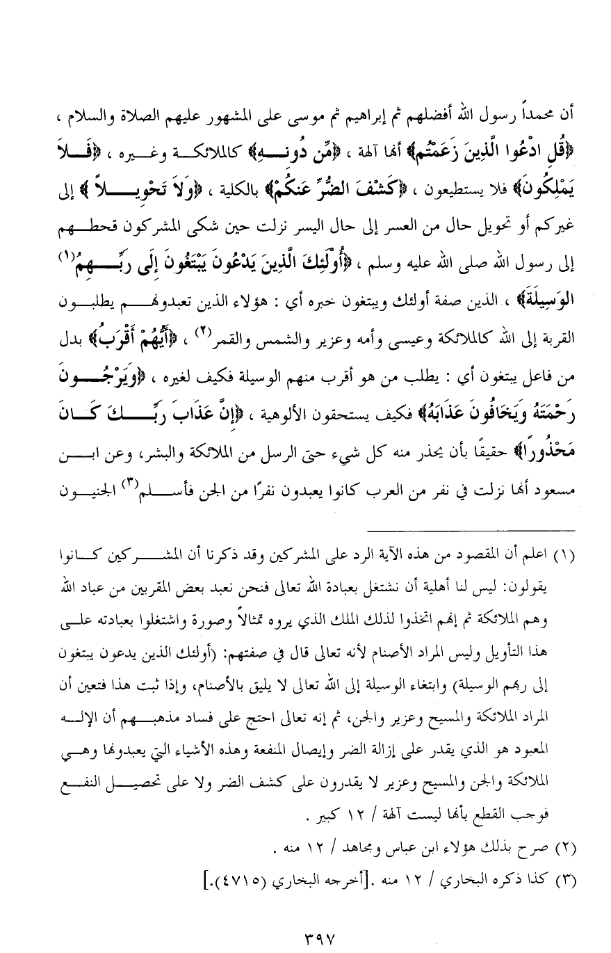 أن محمدًا رسول الله أفضلهم ثم إبراهيم ثم موسى على المشهور عليهم الصلاة والسلام، (قُلِ ادْعُوا الَّذِينَ زَعَمتم) أنها آلهة، (مِّن دُونِهِ) كالملائكة وغيره، (فَلا يَمْلِكُونَ) فلا يستطيعون، (كَشْفَ الضُّرِّ عَنكُمْ) بالكلية، (وَلاَ تَحْوِيلاً) إلى غيركم أو تحويل حال من العسر إلى حال اليسر نزلت حين شكى المشركون قحطهم إلى رسول الله - صلى الله عليه وسلم - (أُولَئِكَ الَّذِينَ يَدْعُونَ يَبْتَغُونَ إِلَى رَبِّهِمُ الْوَسِيلَةَ)، الذين صفة أولئك ويبتغون خبره أي: هؤلاء الذين تعبدونهم يطلبون القربة إلى الله كالملائكة وعيسى وأمه وعزير والشمس والقمر، (أَيُّهُمْ أَقْرَبُ) بدل من فاعل يبتغون أي: يطلب من هو أقرب منهم الوسيلة فكيف لغيره، (وَيَرْجُون رَحْمَتَهُ وَيَخَافُونَ عَذَابَهُ) فكيف يستحقون الألوهية، (إِنَّ عَذَابَ رَبِّكَ كَانَ مَحْذُورًا) حقيقًا بأن يحذر منه كل شيء حتى الرسل من الملائكة والبشر، وعن ابن مسعود أنها نزلت في نفر من العرب كانوا يعبدون نفرًا من الجن فأسلم الجنيون