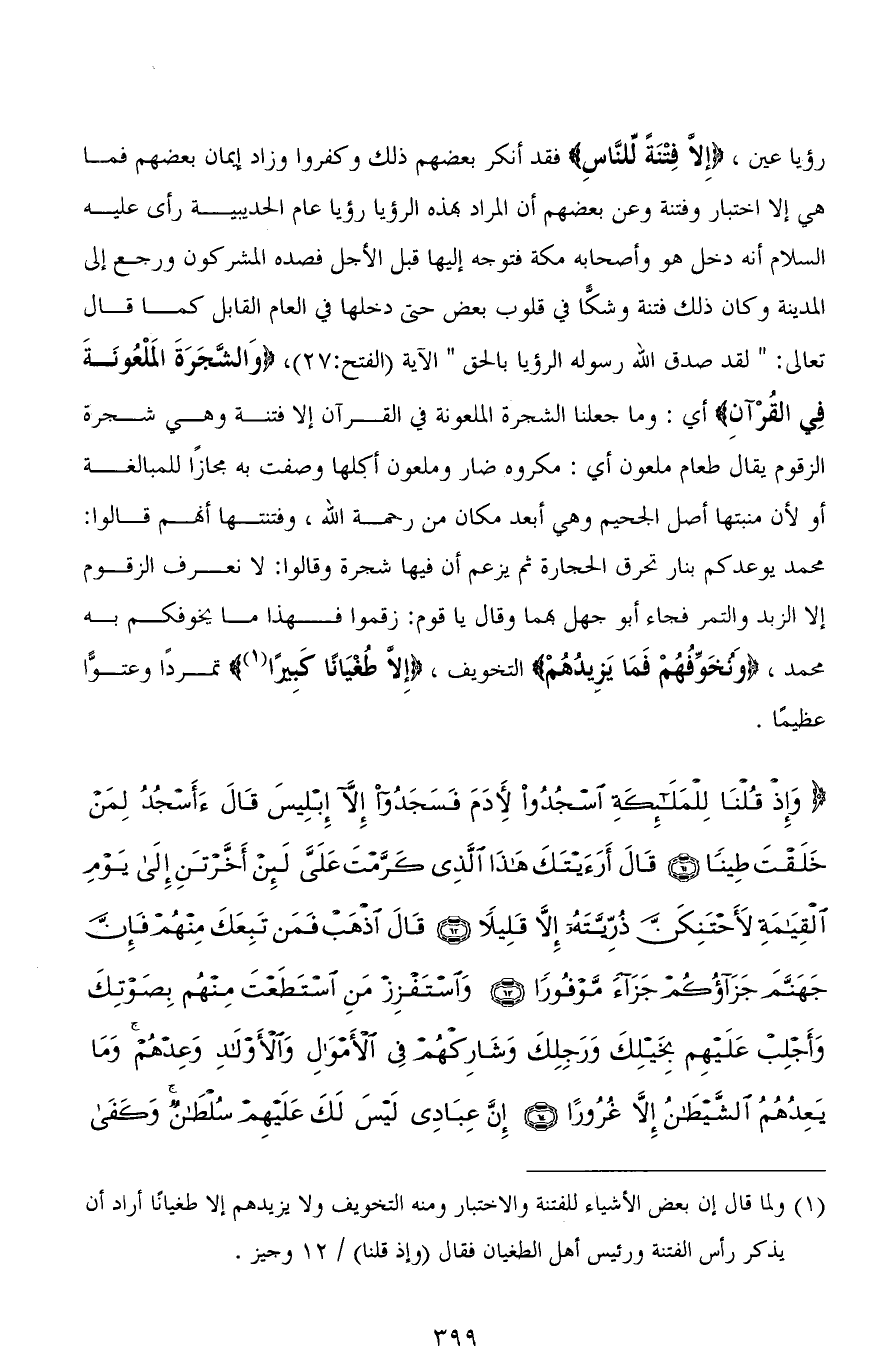 رؤيا عين، (إِلَّا فِتْنَةً لِلنَّاسِ) فقد أنكر بعضهم ذلك وكفروا وزاد إيمان بعضهم فما هي إلا اختبار وفتنة وعن بعضهم أن المراد بهذه الرؤيا رؤيا عام الحديبية رأى عليه السلام أنه دخل هو وأصحابه مكة فتوجه إليها قبل الأجل فصدَّه المشركون ورجع إلى المدينة وكان ذلك فتنة وشكًّا في قلوب بعض حتى دخلها في العام القابل كما قال تعالى: (لَقَدْ صَدَقَ اللهُ رَسُولَهُ الرُّؤْيَا بِالْحَقِّ) الآية [الفتح: 27]، (وَالشَّجَرَةَ المَلْعُونَةَ في القُرْآن) أي: وما جعلنا الشجرة الملعونة في القرآن إلا فتنة وهي شجرة الزقوم يقال طعام ملعون أي: مكروه ضار وملعون أكلها وصفت به مجازًا للمبالغة أو لأن منبتها أصل الجحيم وهي أبعد مكان من رحمة الله، وفتنتها أنَّهم قالوا: محمد يوعدكم بنار تحرق الحجارة ثم يزعم أن فيها شجرة وقالوا: لا نعرف الزقوم إلا الزبد والتمر فجاء أبو جهل بهما وقال يا قوم: زقموا فهذا ما يخوفكم به محمد، (وَنُخَوِّفُهُمْ فَمَا يَزيدُهُمْ) التخويف، (إِلَّا طُغْيَانًا كَبِيرًا) تمردًا وعتوًّا عظيمًا.