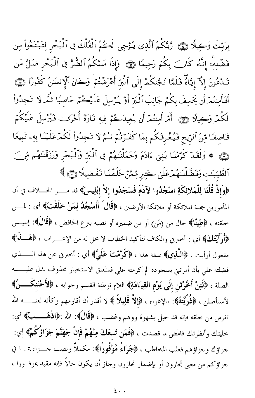 بِرَبِّكَ وَكِيلًا (65) رَبُّكُمُ الَّذِي يُزْجِي لَكُمُ الْفُلْكَ فِي الْبَحْرِ لِتَبْتَغُوا مِنْ فَضْلِهِ إِنَّهُ كَانَ بِكُمْ رَحِيمًا (66) وَإِذَا مَسَّكُمُ الضُّرُّ فِي الْبَحْرِ ضَلَّ مَنْ تَدْعُونَ إِلَّا إِيَّاهُ فَلَمَّا نَجَّاكُمْ إِلَى الْبَرِّ أَعْرَضْتُمْ وَكَانَ الْإِنْسَانُ كَفُورًا (67) أَفَأَمِنْتُمْ أَنْ يَخْسِفَ بِكُمْ جَانِبَ الْبَرِّ أَوْ يُرْسِلَ عَلَيْكُمْ حَاصِبًا ثُمَّ لَا تَجِدُوا لَكُمْ وَكِيلًا (68) أَمْ أَمِنْتُمْ أَنْ يُعِيدَكُمْ فِيهِ تَارَةً أُخْرَى فَيُرْسِلَ عَلَيْكُمْ قَاصِفًا مِنَ الرِّيحِ فَيُغْرِقَكُمْ بِمَا كَفَرْتُمْ ثُمَّ لَا تَجِدُوا لَكُمْ عَلَيْنَا بِهِ تَبِيعًا (69) وَلَقَدْ كَرَّمْنَا بَنِي آدَمَ وَحَمَلْنَاهُمْ فِي الْبَرِّ وَالْبَحْرِ وَرَزَقْنَاهُمْ مِنَ الطَّيِّبَاتِ وَفَضَّلْنَاهُمْ عَلَى كَثِيرٍ مِمَّنْ خَلَقْنَا تَفْضِيلًا (70)