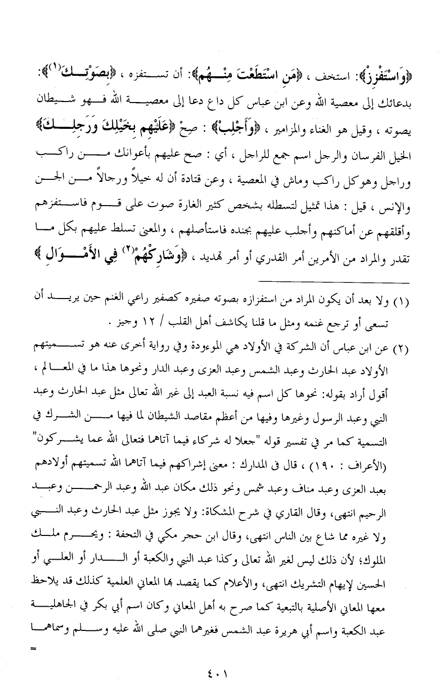 (وَاسْتَفزِزْ): استخف، (مَنِ اسْتَطَعْتَ مِنْهُم): أن تستفزه، (بِصَوْتِكَ): بدعائك إلى معصية الله وعن ابن عباس كل داع دعا إلى معصية الله فهو شيطان يصوته، وقيل هو الغناء والمزامير، (وَأَجْلِبْ): صِحْ (عَلَيْهِم بِخَيْلِكَ وَرَجِلِكَ) الخيل الفرسان والرجل اسم جمع للراجل، أي: صح عليهم بأعوانك من راكب وراجل وهو كل راكب وماشٍ في المعصية، وعن قتادة أن له خيلاً ورجالاً من الجن والإنس، قيل: هذا تمثيل لتسطله بشخص كثير الغارة صوت على قوم فاستفزهم وأقلقهم عن أماكنهم وأجلب عليهم بجنده فاستأصلهم، والمعنى تسلط عليهم بكل ما تقدر والمراد من الأمرين أمر القدري أو أمر تهديد، (وَشَارِكْهُمْ فَى الأَمْوَالِ)