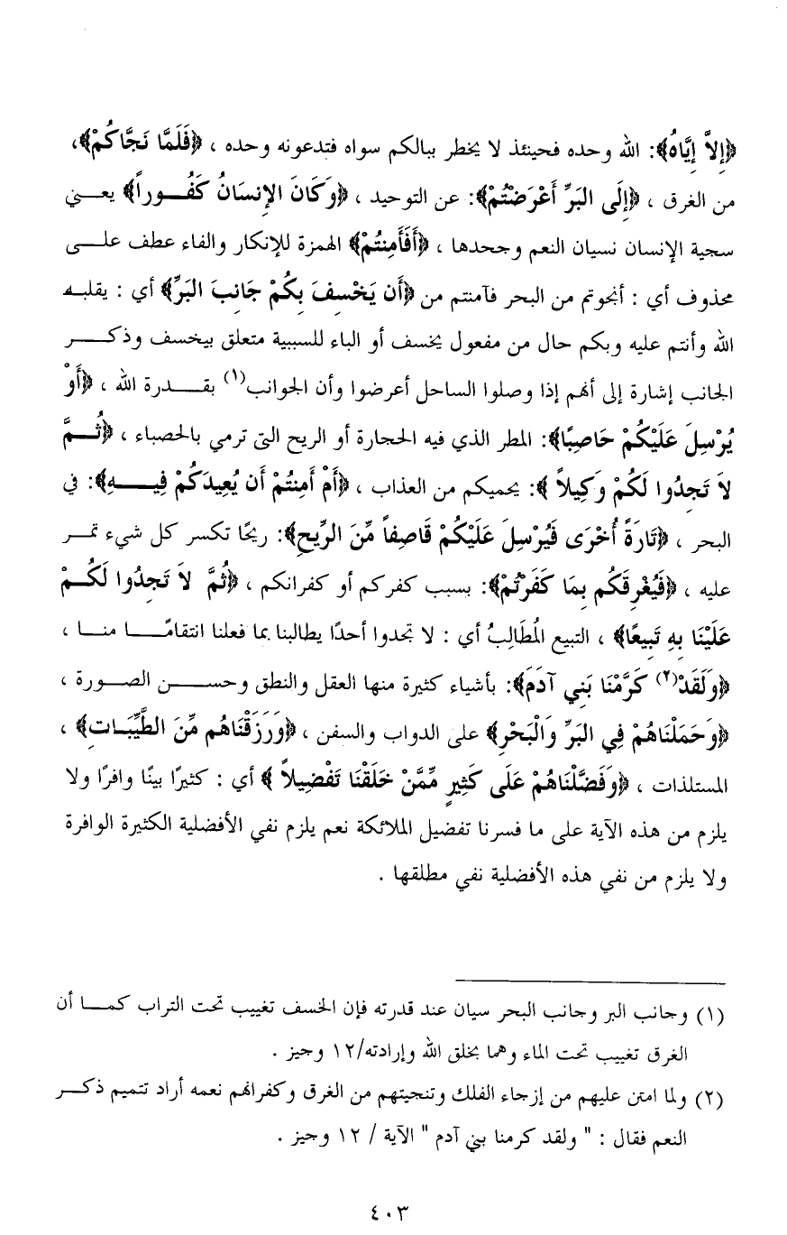 (إِلَّا إِيَّاهُ): الله وحده فحينئذ لا يخطر ببالكم سواه فتدعونه وحده، (فَلَمَّا نَجَّاكمْ)، من الغرق، (إِلَى البَرِّ أَعْرَضتمْ): عن التوحيد، (وَكَانَ الإِنسَان كَفُورًا) يعني سجية الإنسان نسيان النعم وجحدها، (أَفَأَمِنْتُمْ) الهمزة للإنكار والفاء عطف على محذوف أي: أنجوتم من البحر فأمنتم من (أَن يَخْسِفَ بِكمْ جَانِبَ البَرِّ) أي: يقلبه الله وأنتم عليه وبكم حال من مفعول يخسف أو الباء للسببية متعلق بـ يخسف وذكر الجانب إشارة إلى أنهم إذا وصلوا الساحل أعرضوا وأن الجوانب بقدرة الله، (أَوْ يُرْسِلَ عَلَيْكُمْ حَاصِبًا): المطر الذي فيه الحجارة أو الريح التي ترمي بالحصباء، (ثُمَّ لاَ تَجِدوا لَكمْ وَكِيلاً): يحميكم من العذاب، (أَمْ أَمِنتمْ أَن يُعِيدَكمْ فِيهِ): في البحر، (تَارَةً أُخْرَى فَيُرْسِلَ عَلَيْكُمْ قَاصِفًا مِنَ الرِّيحِ): ريحًا تكسر كل شيء تمر عليه، (فَيُغْرِقَكُمْ بِمَا كَفَرْتُمْ): بسبب كفركم أو كفرانكم، (ثمَّ لاَ تَجِدُوا لَكُمْ عَلَيْنَا بِهِ تَبِيعًا)، التبيع المُطَالِبُ أي: لا تجدوا أحدًا يطالبنا بما فعلنا انتقامًا منا، (وَلَقَدْ كَرَّمْنَا بَنِي آدَمَ): بأشياء كثيرة منها العقل والنطق وحسن الصورة، (وَحَمَلْنَاهُمْ فِي البَرِّ وَالْبَحْرِ) على الدواب والسفن، (وَرَزَقْنَاهُم مِّنَ الطيِّبَاتِ)، المستلذات، (وَفَضَّلْنَاهُمْ عَلَى كَثِيرٍ مِمَّنْ خَلَقْنَا تَفْضِيلًا) أي: كثيرًا بينًا وافرًا ولا يلزم من هذه الآية على ما فسرنا تفضيل الملائكة نعم يلزم نفي الأفضلية الكثيرة الوافرة ولا يلزم من نفي هذه الأفضلية نفي مطلقها.