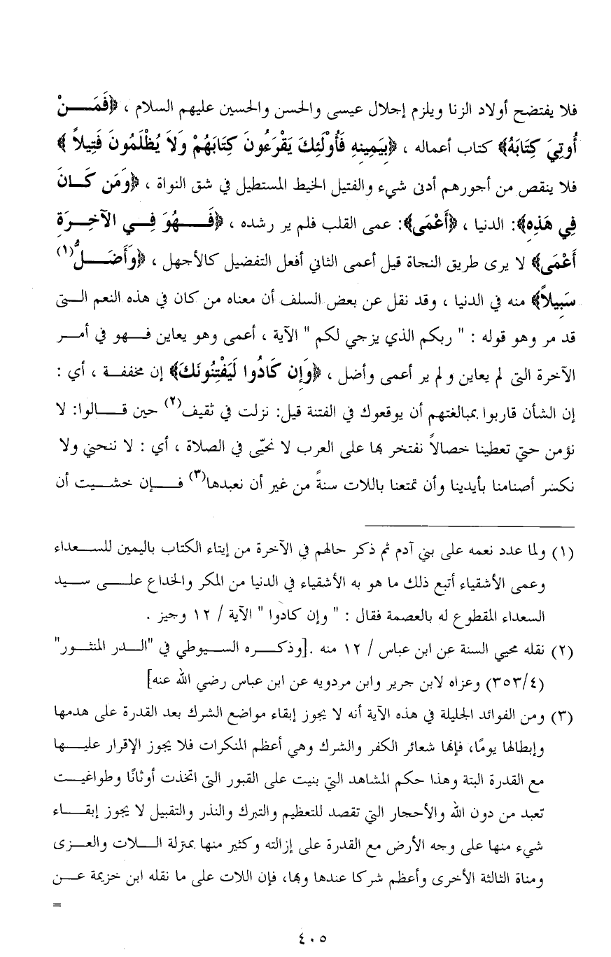 فلا يفتضح أولاد الزنا ويلزم إجلال عيسى والحسن والحسين عليهم السلام، (فمَن أُوتِيَ كِتَابَهُ) كتاب أعماله، (بِيَمِينِهِ فَأُولئِكَ يَقْرَءُونَ كِتَابَهُمْ وَلاَ يُظْلَمُونَ فَتِيلاً) فلا ينقص من أجورهم أدنى شيء والفتيل الخيط المستطيل في شق النواة، (وَمَن كَانَ فِي هَذِهِ): الدنيا، (أَعْمَى): عمى القلب فلم ير رشده، (فَهُوَ فِي الْآخِرَةِ أَعْمَى) لا يرى طريق النجاة قيل أعمى الثاني أفعل التفضيل كالأجهل، (وَأَضَلُّ سَبِيلاً) منه في الدنيا، وقد نقل عن بعض السلف أن معناه من كان في هذه النعم التي قد مر وهو قوله: (رَبُّكُمُ الَّذِي يُزْجِي لَكُمُ) الآية، أعمى وهو يعاين فهو في أمر الآخرة التي لم يعاين ولم ير أعمى وأضل، (وَإِنْ كَادُوا لَيَفْتِنُونَكَ) إن مخففة، أي: إن الشأن قاربوا بمبالغتهم أن يوقعوك في الفتنة قيل: نزلت في ثقيف حين قالوا: لا نؤمن حتي تعطينا خصالاً نفتخر بها على العرب [لا نجبي] في الصلاة، أي: لا ننحني ولا نكسر أصنامنا بأيدينا وأن تمتعنا باللات سنةً من غير أن نعبدها فإن خشيت أن