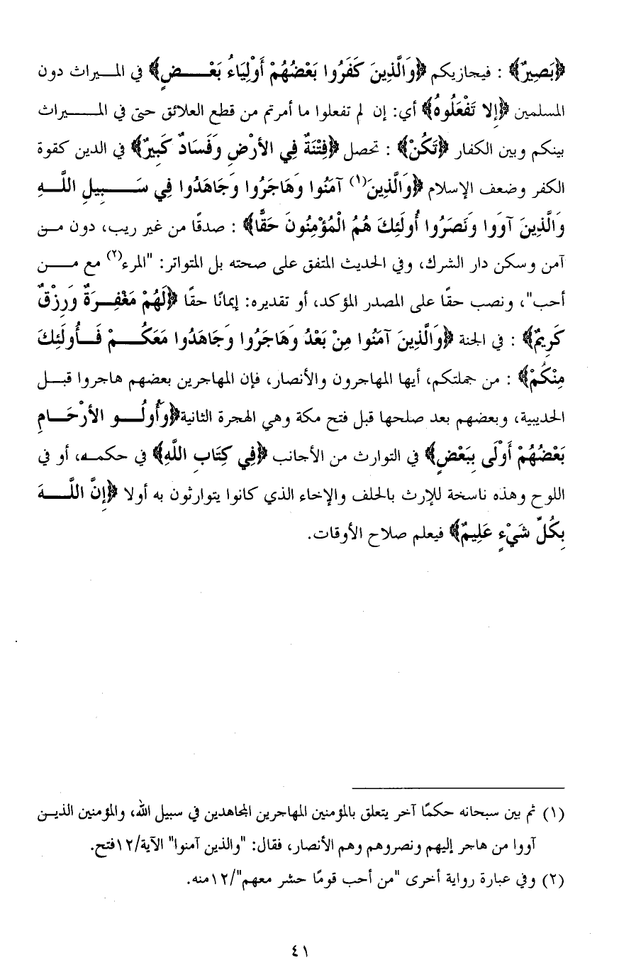 (بَصِيرٌ): فيجازيكم (وَالَّذِينَ كَفَرُوا بَعْضُهُمْ أَوْلِيَاءُ بَعْضٍ) في الميراث دون المسلمين (إِلا تَفْعَلُوهُ) أي: إن لم تفعلوا ما أمرتم من قطعِ العلائق حتَّى في الميراث بينكم وبين الكفار (تَكُنْ): تحصل (فِتْنَةٌ فِي الْأَرْضِ وَفَسَادٌ كَبِيرٌ) في الدين كقوة الكفر وضعف الإسلام (وَالَّذِينَ آمَنُوا وَهَاجَرُوا وَجَاهَدُوا فِي سَبِيلِ اللهِ وَالَّذِينَ آوَوْا وَنَصَرُوا أُولَئِكَ هُمُ الْمُؤْمِنُونَ حَقًّا): صدقًا من غير ريب، دون من آمن وسكن دار الشرك، وفي الحديث المتفق على صحته بل المتواتر: " المرء مع من أحب "، ونصب حقًا على المصدر المؤكد، أو تقديره: إيمانًا حقًا (لَهُمْ مَغْفِرَةٌ وَرِزْقٌ كَرِيمٌ): في الجنة (وَالَّذِينَ آمَنُوا مِنْ بَعْدُ وَهَاجَرُوا وَجَاهَدُوا مَعَكُمْ فَأُولَئِكَ مِنْكمْ): من جملتكم، أيها المهاجرون والأنصار، فإن المهاجرين بعضهم هاجروا قبل الحديبية، وبعضهم بعد صلحها قبل فتح مكة وهي الهجرة الثانية (وَأُولُو الْأَرْحَامِ بَعْضُهُمْ أَوْلَى بِبَعْضٍ) في التوارث من الأجانب (فِي كِتَابِ اللهِ) في حكمه، أو في اللوح وهذه ناسخة للإرث بالحلف والإخاء الذي كانوا يتوارثون به أولاً (إِنَّ اللهَ بِكُلِّ شَيْءٍ عَلِيمٌ) فيعلم صلاح الأوقات.