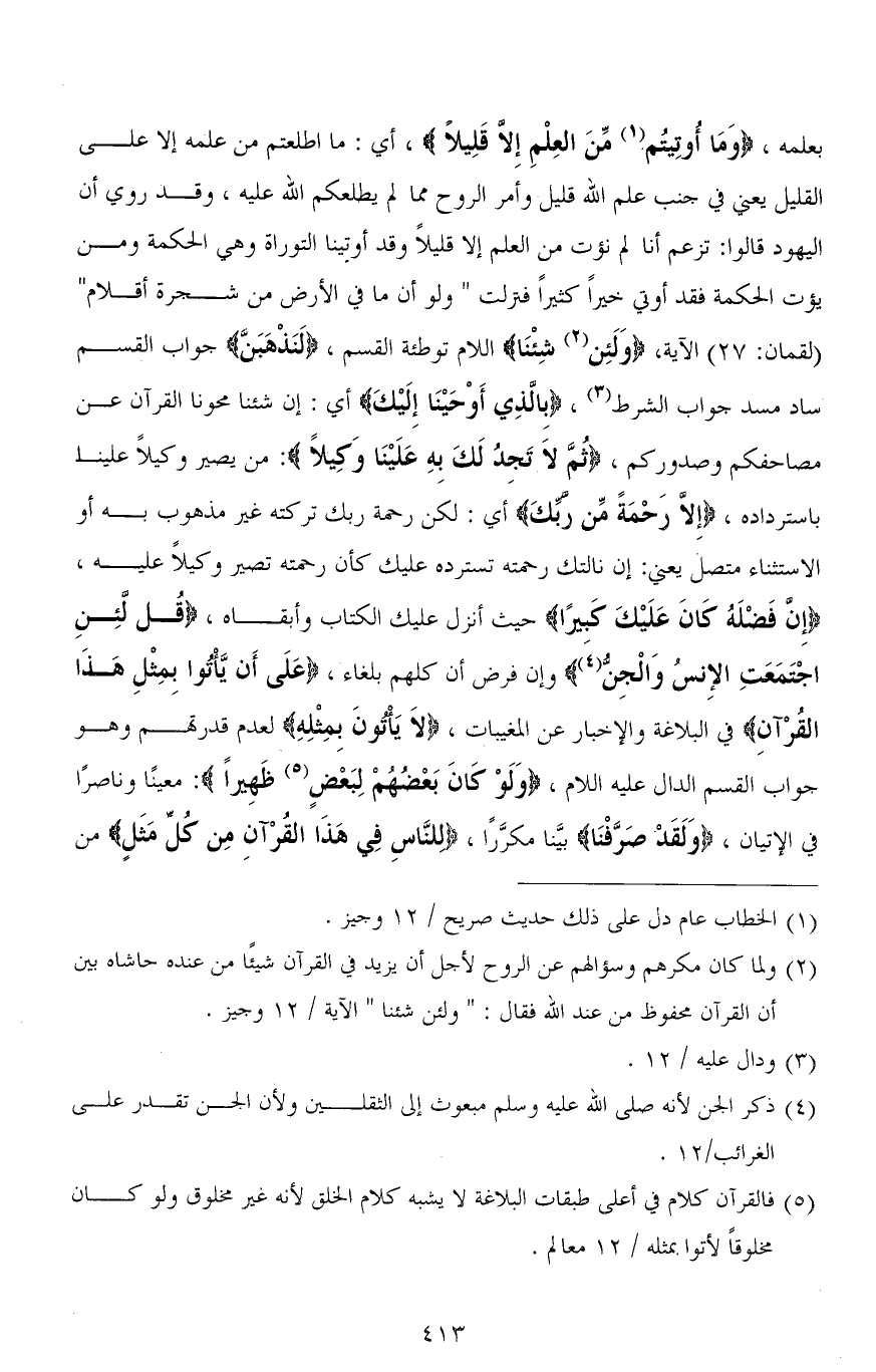 بعلمه، (وَمَا أُوتِيتم مِّنَ العِلْمِ إِلا قَلِيلاً)، أي: ما اطلعتم من علمه إلا على القليل يعني في جنب علم الله قليل وأمر الروح مما لم يطلعكم الله عليه، وقد روي أن اليهود قالوا: تزعم أنا لم نؤت من العلم إلا قليلاً وقد أوتينا التوراة وهي الحكمة ومن يؤت الحكمة فقد أوتي خيرًا كثيرًا فنزلت (وَلَوْ أَنَّمَا فِي الْأَرْضِ مِنْ شَجَرَةٍ أَقْلَامٌ) [لقمان: 27] الآية، (وَلَئِنْ شِئْنَا) اللام توطئة القسم، (لَنَذْهَبَنَّ) جواب القسم ساد مسد جواب الشرط، (بِالذِي أَوْحَيْنَا إِلَيْكَ) أي: إن شئنا محونا القرآن عن مصاحفكم وصدوركم، (ثُمَّ لَا تَجِدُ لَكَ بِهِ عَلَيْنَا وَكِيلًا): من يصير وكيلاً علينا باسترداده، (إِلَّا رَحْمَةً مِنْ رَبِّكَ) أي: لكن رحمة ربك تركته غير مذهوب به أو الاستثناء متصل يعني: إن نالتك رحمته تسترده عليك كأن رحمته تصير وكيلاً عليه، (إِنَّ فَضْلَهُ كَانَ عَلَيْكَ كَبِيرًا) حيث أنزل عليك الكتاب وأبقاه، (قُلْ لَئِنِ اجْتَمَعَتِ الْإِنْسُ وَالْجِنُّ) وإن فرض أن كلهم بلغاء، (عَلَى أَنْ يَأْتُوا بِمِثْلِ هَذَا الْقُرْآنِ) في البلاغة والإخبار عن المغيبات، (لَا يَأْتُونَ بِمِثْلِهِ) لعدم قدرتهم وهو جواب القسم الدال عليه اللام، (وَلَوْ كَانَ بَعْضُهُمْ لِبَعْضٍ ظَهِيرًا): معينًا وناصرًا في الإتيان، (وَلَقَدْ صَرَّفْنَا) بيَّنا مكرَّرًا، (لِلنَّاسِ فِي هَذَا الْقُرْآنِ مِنْ كُلِّ مَثَلٍ) من