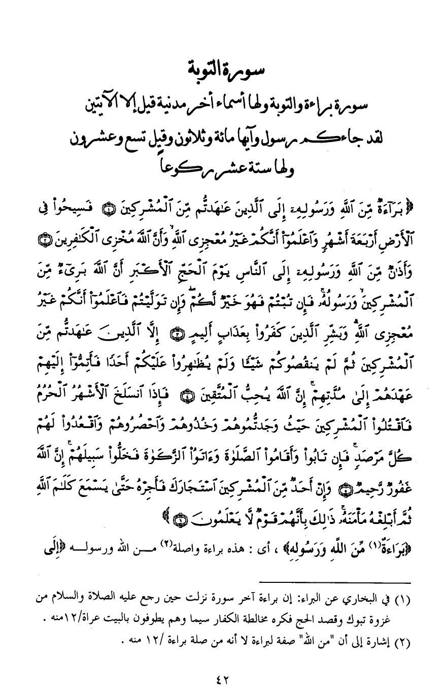 (بَرَاءَةٌ مِنَ اللهِ وَرَسُولِهِ إِلَى الَّذِينَ عَاهَدْتُمْ مِنَ الْمُشْرِكِينَ (1) فَسِيحُوا فِي الْأَرْضِ أَرْبَعَةَ أَشْهُرٍ وَاعْلَمُوا أَنَّكُمْ غَيْرُ مُعْجِزِي اللهِ وَأَنَّ اللهَ مُخْزِي الْكَافِرِينَ (2) وَأَذَانٌ مِنَ اللهِ وَرَسُولِهِ إِلَى النَّاسِ يَوْمَ الْحَجِّ الْأَكْبَرِ أَنَّ اللهَ بَرِيءٌ مِنَ الْمُشْرِكِينَ وَرَسُولُهُ فَإِنْ تُبْتُمْ فَهُوَ خَيْرٌ لَكُمْ وَإِنْ تَوَلَّيْتُمْ فَاعْلَمُوا أَنَّكُمْ غَيْرُ مُعْجِزِي اللهِ وَبَشِّرِ الَّذِينَ كَفَرُوا بِعَذَابٍ أَلِيمٍ (3) إِلَّا الَّذِينَ عَاهَدْتُمْ مِنَ الْمُشْرِكِينَ ثُمَّ لَمْ يَنْقُصُوكُمْ شَيْئًا وَلَمْ يُظَاهِرُوا عَلَيْكُمْ أَحَدًا فَأَتِمُّوا إِلَيْهِمْ عَهْدَهُمْ إِلَى مُدَّتِهِمْ إِنَّ اللهَ يُحِبُّ الْمُتَّقِينَ (4) فَإِذَا انْسَلَخَ الْأَشْهُرُ الْحُرُمُ فَاقْتُلُوا الْمُشْرِكِينَ حَيْثُ وَجَدْتُمُوهُمْ وَخُذُوهُمْ وَاحْصُرُوهُمْ وَاقْعُدُوا لَهُمْ كُلَّ مَرْصَدٍ فَإِنْ تَابُوا وَأَقَامُوا الصَّلَاةَ وَآتَوُا الزَّكَاةَ فَخَلُّوا سَبِيلَهُمْ إِنَّ اللهَ غَفُورٌ رَحِيمٌ (5) وَإِنْ أَحَدٌ مِنَ الْمُشْرِكِينَ اسْتَجَارَكَ فَأَجِرْهُ حَتَّى يَسْمَعَ كَلَامَ اللهِ ثُمَّ أَبْلِغْهُ مَأْمَنَهُ ذَلِكَ بِأَنَّهُمْ قَوْمٌ لَا يَعْلَمُونَ (6)