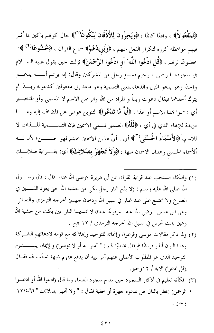 (لَمَفْعُولًا)، واقعًا كائنًا، (وَيَخِرُّونَ لِلْأَذْقَانِ يَبْكُونَ) حال كونهم باكين لما أثر فيهم مواعظه كرره لتكرار الفعل منهم، (وَيَزِيدُهُمْ) سماع القرآن، (خُشُوعًا): خضوعًا لربِّهم، (قُلِ ادْعُوا اللهَ أَوِ ادْعُوا الرَّحْمَنَ) نزلت حين يقول عليه السلام في سجوده يا رحمن يا رحيم فسمع رجل من المشركين وقال: إنه يزعم أنه يدعو واحدًا وهو يدعو اثنين والدعاء بمعني التسمية وهو متعد إلى مفعولين كدعوته زيدًا ثم يترك أحدهما فيقال دعوت زيدًا والمراد من الله والرحمن الاسم لا المسمى وأو للتخيير أي: سموا بهذا الاسم أو بهذا، (أَيا مَّا تَدْعُوا) التنوين عوض عن المضاف إليه وما مزيدة للإبهام الذي في أي، (فَلَهُ) الضمير لمسمي الاسمين فإن التسمية للذات لا للاسم، (الأَسْمَاءُ الحُسْنَى) أي: أي هذين الاسمين سميتم فهو حسن؛ لأن له الأسماء الحسني وهذان الاسمان منها، (وَلاَ تَجْهَرْ بِصَلاِتِكَ) أي: بقراءة صلاتك