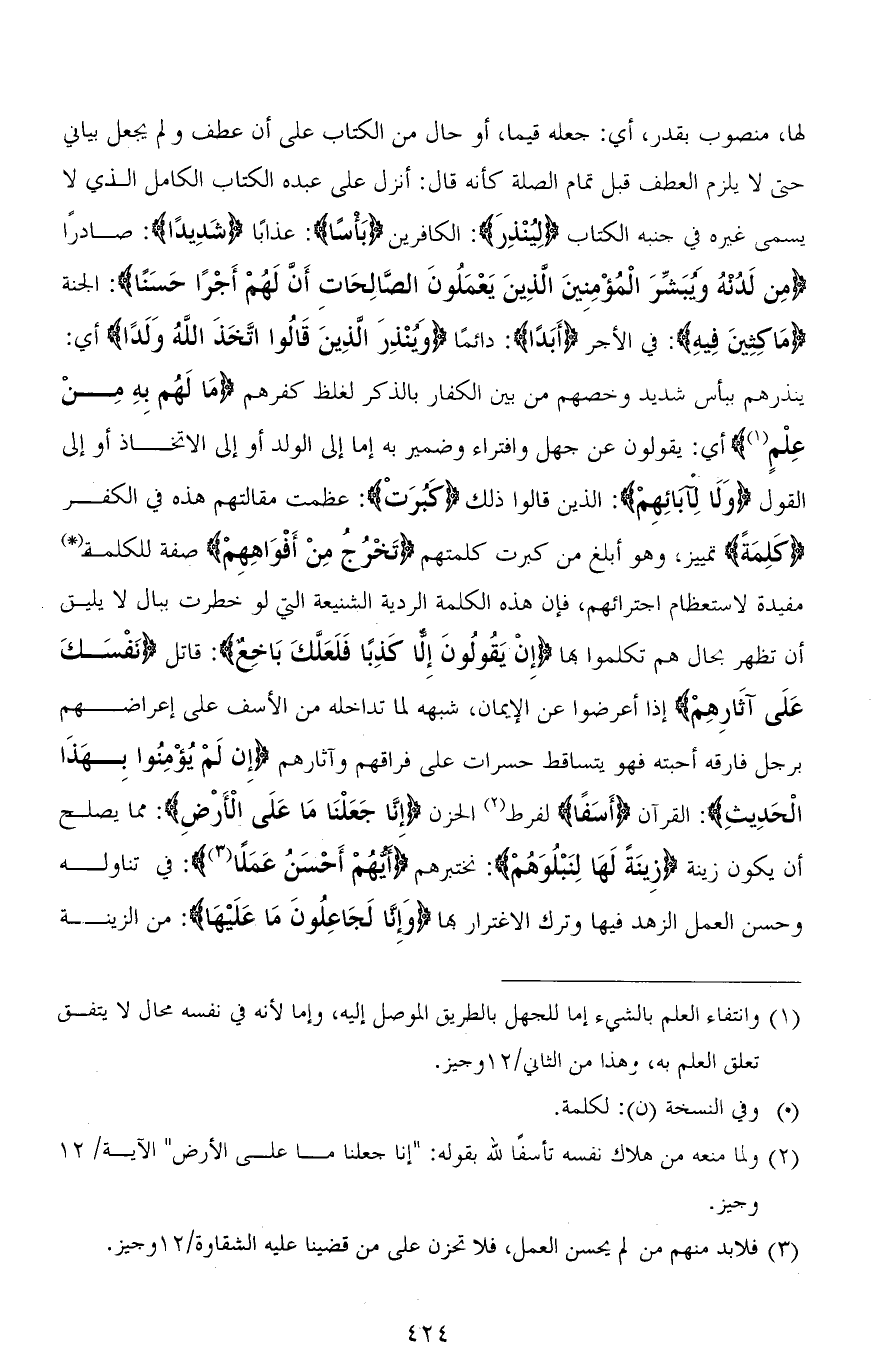 لها، منصوب بقدر، أي: جعله قيما، أو حال من الكتاب على أن عطف ولم يجعل بياني حتى لا يلزم العطف قبل تمام الصلة كأنه قال: أنزل على عبده الكتاب الكامل الذي لا يسمى غيره في جنبه الكتاب (لِيُنْذِرَ): الكافرين (بَأسًا): عذابًا (شَدِيدًا): صادرًا (مِن لَدُنْهُ وَيُبَشِّرَ الْمُؤْمِنِينَ الَّذِينَ يَعْمَلُونَ الصَّالِحَاتِ أَن لَهُمْ أَجْرًا حَسَنًا): الجنة (مَاكِثينَ فِيهِ): في الأجر (أَبَدًا): دائمًا (وَيُنْذِرَ الَّذِينَ قَالُوا اتَّخَذَ اللهُ وَلَدًا) أي: ينذرهم ببأس شديد وخصهم من بين الكفار بالذكر لغلظ كفرهم (ما لَهُم بِهِ مِن عِلْمٍ) أي: يقولون عن جهل وافتراء وضمير به إما إلى الولد أو إلى الاتخاذ أو إلى القول (وَلَا لِآبَائِهِمْ): الذين قالوا ذلك (كَبُرَتْ): عظمت مقالتهم هذه في الكفر (كلَمَةً) تمييز، وهو أبلغ من كبرت كلمتهم (تخرُجُ مِنْ أَفْوَاهِهِمْ) صفة للكلمة مفيدة لاستعظام اجترائهم، فإن هذه الكلمة الردية الشنيعة التي لو خطرت ببال لا يليق أن تظهر بحال هم تكلموا بها (إِنْ يَقُولُونَ إِلَّا كَذِبًا فَلَعَلَّكَ بَاخِعٌ): قاتل (نَفْسَكَ عَلَى آثَارِهِمْ) إذا أعرض بها عن الإيمان، شبهه لما تداخله من الأسف على إعراضهم برجل فارقه أحبته فهو يتساقط حسرات على فراقهم وآثارهم (إِن لَمْ يُؤْمِنُوا بِهذا الْحَدِيثِ): القرآن (أَسَفًا) لفرط الحزن (إِنَّا جَعَلْنَا مَا عَلَى الْأَرْضِ): مما يصلح أن يكون زينة (زِينَةَّ لَهَا لِنَبْلُوَهُمْ): نختبرهم (أَيُّهُمْ أَحْسَنُ عَمَلًا): في تناوله وحسن العمل الزهد فيها وترك الاغترار بها (وَإِنَّا لَجَاعِلُونَ مَا عَلَيْهَا): من الزينة