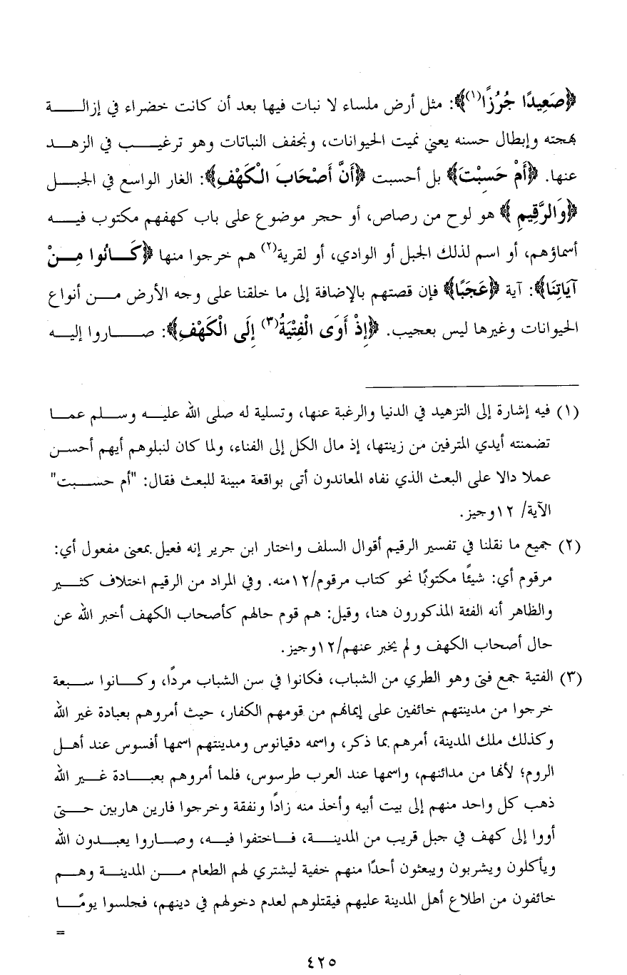 (صَعِيدًا جُرُزًا): مثل أرض ملساء لا نبات فيها بعد أن كانت خضراء في إزالة بهجته وإبطال حسنه يعني نميت الحيوانات، ونجفف النباتات وهو ترغيب في الزهد عنها. (أَمْ حَسِبْتَ) بل أحسبت (أَنَّ أَصْحَابَ الْكَهْفِ): الغار الواسع في الجبل (وَالرَّقِيمِ) هو لوح من رصاص، أو حجر موضوع على باب كهفهم مكتوب فيه أسماؤهم، أو اسم لذلك الجبل أو الوادي، أو لقرية هم خرجوا منها (كَانُوا مِنْ آياتِنَا): آية (عَجَبًا) فإن قصتهم بالإضافة إلى ما خلقنا على وجه الأرض من أنواع الحيوانات وغيرها ليس بعجيب. (إِذْ أَوَى الْفِتْيَةُ إِلَى الْكَهْفِ): صاروا إليه