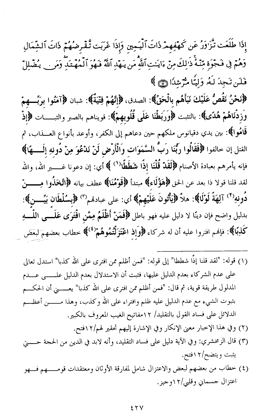 (نَحْنُ نَقُصُّ عَلَيْكَ نَبَأَهُم بالْحَقِّ): الصدق، (إِنَّهُمْ فِتْيَةٌ): شبان (آمَنُوا بِرَبِّهِمْ وَزِدْنَاهُمْ هُدًى): بالتثبت (وَرَبَطْنَا عَلَى قُلُوبِهِمْ): قويناهم بالصبر والثبات (إِذْ قَامُوا): بين يدي دقيانوس ملكهم حين دعاهم إلى الكفر، وأوعد بأنواع العذاب، ثم القتل إن خالفوا (فَقَالُوا رَبُّنَا رَبُّ السَّمَاوَاتِ وَالْأَرْضِ لَنْ نَدْعُوَ مِنْ دُونِهِ إِلَهًا) فإنه يأمرهم بعبادة الأصنام (لَقَدْ قُلْنَا إِذًا شَطَطًا) أي: إن دعونا غير الله، والله لقد قلنا قولاً ذا بعد عن الحق (هَؤُلَاءِ) مبتدأ (قَوْمُنَا) عطف بيانه (اتَّخَذُوا مِنْ دُونِهِ آلِهَةً لَوْلَا): هلَّا (يَأتونَ عَلَيْهِمْ) أي: على عبادتهم (بِسُلْطَانٍ بَيِّنٍ): بدليل واضح فإن دينًا لا دليل عليه فهو باطل (فَمَنْ أَظْلَمُ مِمَّنِ افْتَرَى عَلَى اللهِ كَذِبًا): فإنهم افتروا عليه أن له شركاء (وَإِذ اعْتَزَلْتُمُوهُمْ) خطاب بعضهم لبعضَ