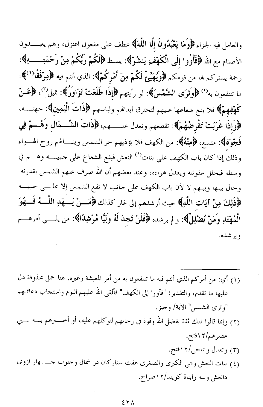 والعامل فيه الجزاء (وَمَا يَعْبُدُونَ إِلَّا اللهَ) عطف على مفعول اعتزل، وهم يعبدون الأصنام مع الله (فَأْوُوا إِلَى الْكَهْفِ يَنْشُرْ): يبسط (لَكُمْ ربّكُمْ مِنْ رَحْمَتِهِ): رحمة يستركم بها من قومكم (وَيُهَيِّئْ لَكُمْ مِنْ أَمْرِكُمْ): الذي أنتم فيه (مِرْفَقًا): ما تنتفعون به (وتَرَى الشَّمْسَ): لو رأيتهم (إِذا طَلَعَتْ تَزَاوَرُ): تميل، (عَنْ كَهْفِهِمْ) فلا يقع شعاعها عليهم لتحترق أبدانهم ولباسهم (ذاتَ الْيَمِينِ): جهته، (وَإِذَا غَرَبَتْ تَقْرِضُهُمْ): تقطعهم وتعدل عنهم، (ذَاتَ الشِّمَالِ وَهُمْ فِي فجْوَةٍ): متسع، (منهُ): من الكهف فلا يؤذيهم حر الشمس وينالهم روح الهواء وذلك إذا كان باب الكهف على بنات النعش فيقع الشعاع على جنبيه وهم في وسطه فيحلل عفونته ويعدل هواءه، وعند بعضهم أن الله صرف عنهم الشمس بقدرته وحال بينها وبينهم لا لأن باب الكهف على جانب لا تقع الشمس إلا على جنبيه (ذلِكَ مِنْ آيَاتِ اللهِ) حيث أرشدهم إلى غار كذلك (مَنْ يَهْدِ اللهُ فهُوَ الْمُهْتدِ وَمَنْ يُضلِلْ): ولم يرشده (فَلَنْ تَجِدَ لَهُ وَلِيًّا مُرْشِدًا): من يلي أمرهم ويرشده.