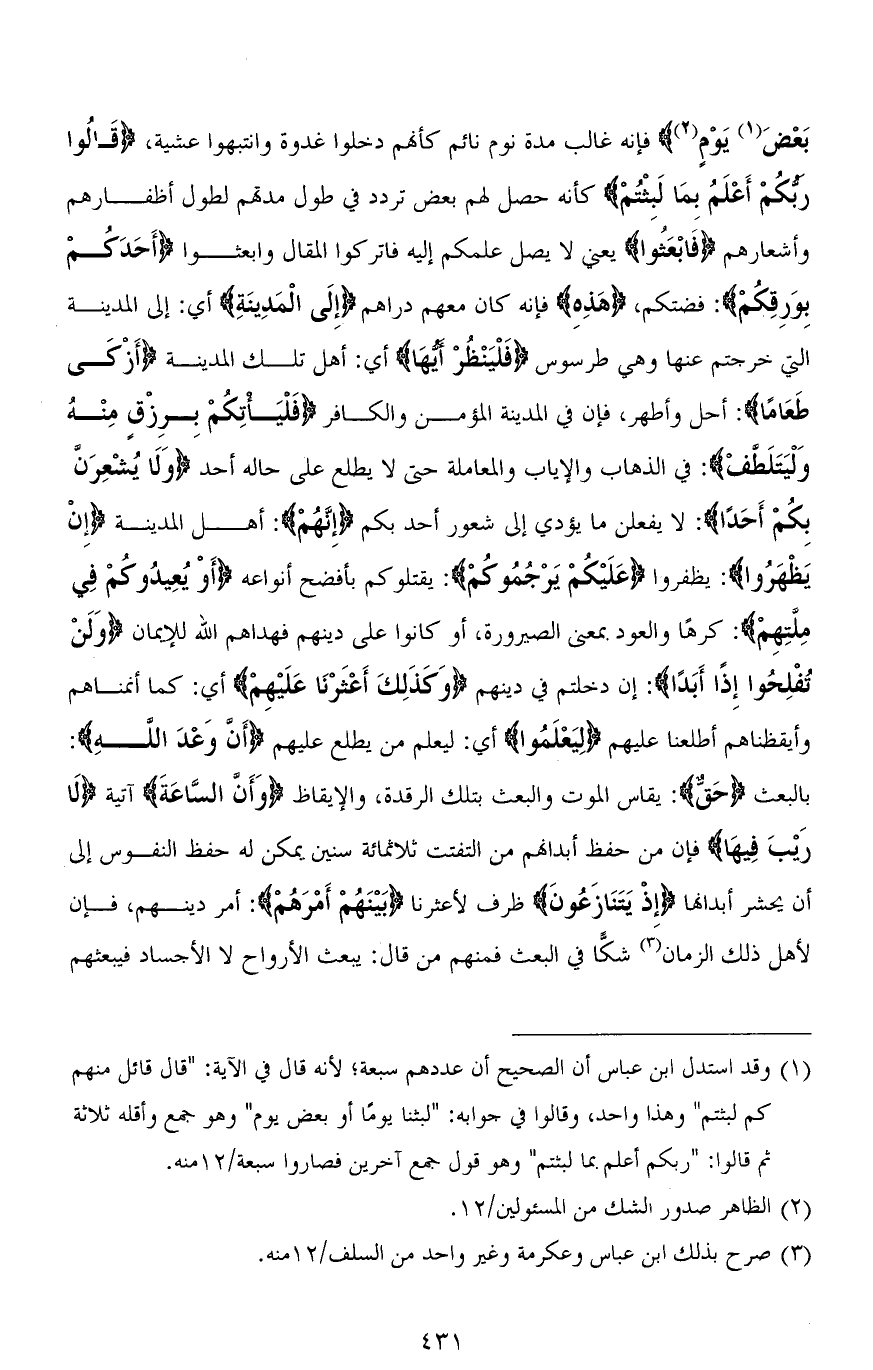 بَعْضَ يَوْمٍ) فإنه غالب مدة نوم نائم كأنهم دخلوا غدوة وانتبهوا عشية، (قَالُوا رَبُّكُمْ أَعْلَمُ بِمَا لَبِثْتُمْ) كأنه حصل لهم بعض تردد في طول مدتهم لطول أظفارهم وأشعارهم (فَابْعَثُوا) يعني لا يصل علمكم إليه فاتركوا المقال وابعثوا (أَحَدَكُم بِوَرِقِكُمْ): فضتكم، (هَذِهِ) فإنه كان معهم دراهم (إِلَى الْمَدِينَةِ) أي: إلى المدينة التي خرجتم عنها وهي طرسوس (فَلْيَنْظُرْ أَيُّهَا) أي: أهل تلك المدينة (أَزْكَى طَعَامًا): أحل وأطهر، فإن في المدينة المؤمن والكافر (فَلْيَأتِكُمْ برِزْقٍ مِنْه وَلْيَتَلَطفْ): في الذهاب والإياب والمعاملة حتى لا يطلع على حاله أحدَ (وَلَا يُشْعِرَنَّ بِكُمْ أَحَدًا): لا يفعلن ما يؤدي إلى شعور أحد بكم (إِنَّهُمْ): أهل المدينة (إِن يَظْهَرُوا): يظفروا (عَلَيْكُمْ يَرْجُمُوكُمْ): يقتلوكم بأفضح أنواعه (أَوْ يُعِيدُوكُمْ فِي مِلَّتِهِمْ): كرهًا والعود بمعنى الصيرورة، أو كانوا على دينهم فهداهم الله للإيمان (وَلَنْ تُفْلِحُوا إِذًا أَبَدًا): إن دخلتم في دينهم (وَكَذَلِكَ أَعْثرْنَا عَلَيْهِمْ) أي: كما أنمناهم وأيقظناهم أطلعنا عليهم (لِيَعْلَمُوا) أي: ليعلم من يطلع عليهم (أَنَّ وَعْدَ اللهِ): بالبعث (حَقٌّ): يقاس الموت والبعث بتلك الرقدة، والإيقاظ (وَأَنَّ السَّاعَةَ) آتية (لَا رَيْبَ فيهَا) فإن من حفظ أبدانهم من التفتت ثلاثمائة سنين يمكن له حفظ النفوس إلى أن يحشر أبدانها (إِذْ يَتنَازَعُونَ) ظرف لـ أَعْثَرْنَا (بَيْنَهُمْ أَمْرَهُمْ): أمر دينهم، فإن لأهل ذلك الزمان شكًّا في البعث فمنهم من قال: يبعث الأرواح لا الأجساد فيبعثهم