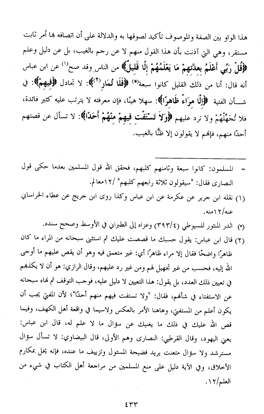 هذا الواو بين الصفة والموصوف تأكيد لصوقها به والدلالة على أن اتصافه بها أمر ثابت مستقر، وهي التي آذنت بأن هذا القول منهم لا عن رجم بالغيب، بل عن دليل وعلم (قُلْ رَبِّي أَعْلَمُ بِعِدَّتِهِمْ مَا يَعْلَمُهُمْ إِلَّى قَليلٌ) من الناس وقد صح عن ابن عباس أنه قال: أنا من ذلك القليل كانوا سبعة (فَلَا تُمَارِ): لا تجادل (فِيهِمْ): في شأن الفتية (إِلَّا مِرَاءً ظَاهِرًا): سهلاً هينًا، فإن معرفته لا يترتب عليه كثير فائدة، فلا تُجَهِّلْهُمْ ولا ترد عليهم (وَلَا تَسْتَفْتِ فِيهِمْ مِنْهُمْ أَحَدًا): لا تسأل عن قصتهم أحدًا منهم، فإنهم لا يقولون إلا ظنًّا بالغيب.