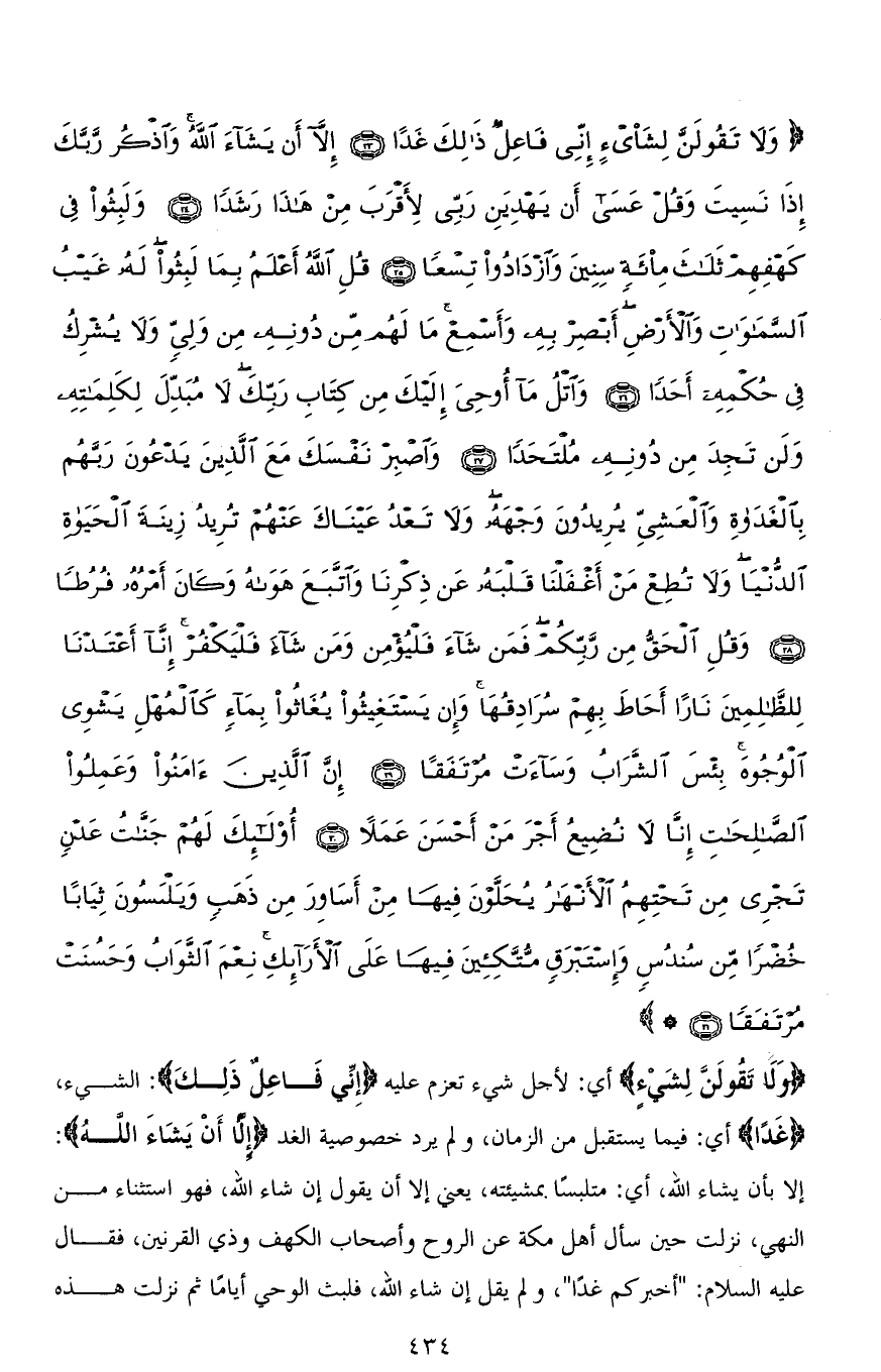 (وَلَا تَقُولَنَّ لِشَيْءٍ إِنِّي فَاعِلٌ ذَلِكَ غَدًا (23) إِلَّا أَنْ يَشَاءَ اللهُ وَاذْكُرْ رَبَّكَ إِذَا نَسِيتَ وَقُلْ عَسَى أَنْ يَهْدِيَنِ رَبِّي لِأَقْرَبَ مِنْ هَذَا رَشَدًا (24) وَلَبِثُوا فِي كَهْفِهِمْ ثَلَاثَ مِائَةٍ سِنِينَ وَازْدَادُوا تِسْعًا (25) قُلِ اللهُ أَعْلَمُ بِمَا لَبِثُوا لَهُ غَيْبُ السَّمَاوَاتِ وَالْأَرْضِ أَبْصِرْ بِهِ وَأَسْمِعْ مَا لَهُمْ مِنْ دُونِهِ مِنْ وَلِيٍّ وَلَا يُشْرِكُ فِي حُكْمِهِ أَحَدًا (26) وَاتْلُ مَا أُوحِيَ إِلَيْكَ مِنْ كِتَابِ رَبِّكَ لَا مُبَدِّلَ لِكَلِمَاتِهِ وَلَنْ تَجِدَ مِنْ دُونِهِ مُلْتَحَدًا (27) وَاصْبِرْ نَفْسَكَ مَعَ الَّذِينَ يَدْعُونَ رَبَّهُمْ بِالْغَدَاةِ وَالْعَشِيِّ يُرِيدُونَ وَجْهَهُ وَلَا تَعْدُ عَيْنَاكَ عَنْهُمْ تُرِيدُ زِينَةَ الْحَيَاةِ الدُّنْيَا وَلَا تُطِعْ مَنْ أَغْفَلْنَا قَلْبَهُ عَنْ ذِكْرِنَا وَاتَّبَعَ هَوَاهُ وَكَانَ أَمْرُهُ فُرُطًا (28) وَقُلِ الْحَقُّ مِنْ رَبِّكُمْ فَمَنْ شَاءَ فَلْيُؤْمِنْ وَمَنْ شَاءَ فَلْيَكْفُرْ إِنَّا أَعْتَدْنَا لِلظَّالِمِينَ نَارًا أَحَاطَ بِهِمْ سُرَادِقُهَا وَإِنْ يَسْتَغِيثُوا يُغَاثُوا بِمَاءٍ كَالْمُهْلِ يَشْوِي الْوُجُوهَ بِئْسَ الشَّرَابُ وَسَاءَتْ مُرْتَفَقًا (29) إِنَّ الَّذِينَ آمَنُوا وَعَمِلُوا الصَّالِحَاتِ إِنَّا لَا نُضِيعُ أَجْرَ مَنْ أَحْسَنَ عَمَلًا (30) أُولَئِكَ لَهُمْ جَنَّاتُ عَدْنٍ تَجْرِي مِنْ تَحْتِهِمُ الْأَنْهَارُ يُحَلَّوْنَ فِيهَا مِنْ أَسَاوِرَ مِنْ ذَهَبٍ وَيَلْبَسُونَ ثِيَابًا خُضْرًا مِنْ سُنْدُسٍ وَإِسْتَبْرَقٍ مُتَّكِئِينَ فِيهَا عَلَى الْأَرَائِكِ نِعْمَ الثَّوَابُ وَحَسُنَتْ مُرْتَفَقًا (31)