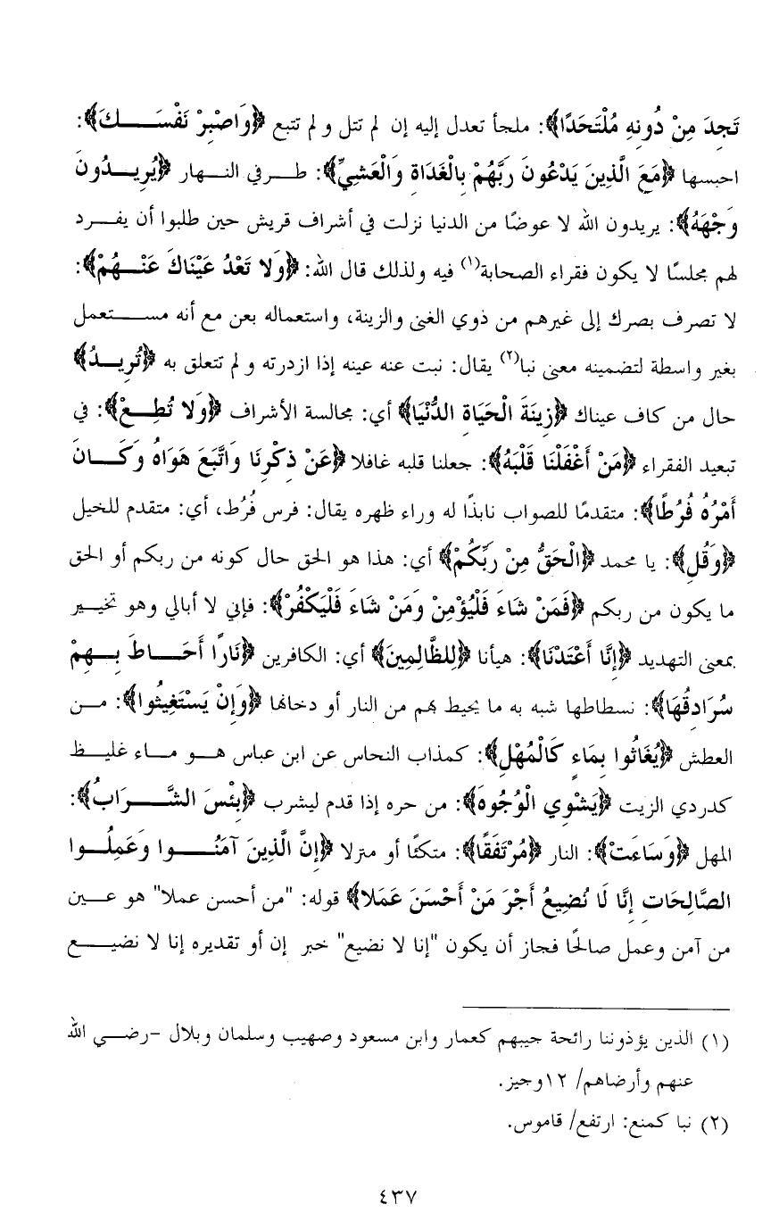 تَجِدَ مِنْ دُونهِ مُلْتَحَدًا): ملجأ تعدل إليه إن لم تتل ولم تتبع (وَاصْبِرْ نَفْسَكَ): احبسها (مَعَ الَّذِينَ يَدْعُونَ رَبَّهُمْ بِالْغَدَاةِ وَالْعَشِيِّ): طرفي النهار (يُرِيدُونَ وَجْهَهُ): يريدون الله لا عوضًا من الدنيا نزلت في أشراف قريش حين طلبوا أن يفرد لهم مجلسًا لا يكون فقراء الصحابة فيه ولذلك قال الله: (وَلا تَعْدُ عَيْنَاكَ عَنْهُمْ): لا تصرف بصرك إلى غيرهم من ذوي الغنى والزينة، واستعماله بـ عن مع أنه مستعمل بغير واسطة لتضمينه معنى نبا يقال: نبت عنه عينه إذا ازدرته ولم تتعلق به (تُرِيدُ) حال من كاف عيناك (زِينَةَ الْحَيَاةِ الدُّنْيَا) أي: مجالسة الأشراف (وَلا تُطِعْ): في تبعيد الفقراء (مَنْ أَغْفَلْنَا قَلْبَهُ): جعلنا قلبه غافلاً (عَنْ ذِكْرِنَا وَاتَّبعَ هَوَاهُ وَكَانَ أَمْرُهُ فُرُطًا): متقدمًا للصواب نابذًا له وراء ظهره يقال: فرس فُرُط، أي: متقدم للخيل (وَقُلِ): يا محمد (الْحَقُّ مِنْ ربكُم) أي: هذا هو الحق حال كونه من ربكم أو الحق ما يكون من ربكم (فَمَنْ شَاءَ فَلْيُؤْمِنْ وَمَنْ شَاءَ فَلْيَكْفُرْ): فإني لا أبالي وهو تخيير بمعنى التهديد (إِنَّا أَعْتَدْنَا): هيأنا (لِلظالِمِينَ) أي: الكافرين (نَارًا أَحَاطَ بهِمْ سُرَادِقُهَا): نسطاطها شبه بِهِ ما يحيط بهم من النار أو دخانها (وَإِنْ يَسْتَغِيثُوا)، من العطش (يُغَاثُوا بِمَاءٍ كَالْمُهْلِ): كمذاب النحاس عن ابن عباس هو ماء غليظ كدردي الزيت (يَشْوِي الْوُجُوهَ): من حره إذا قدم ليشرب (بِئْسَ الشَّرَابُ): المهل (وَسَاءَتْ): النار (مُرْتَفَقًا): متكئًا أو منزلاً (إِنَّ الَّذِينَ آمَنُوا وَعَمِلُوا الصَّالِحَاتِ إِنَّا لَا نُضِيعُ أَجْرَ مَنْ أَحْسَنَ عَمَلًا) قوله: (من أحسن عملاً) هو عين من آمن وعمل صالحًا فجاز أن يكون (إنا لا نضيع) خبر إن أو تقديره إنا لا نضيع