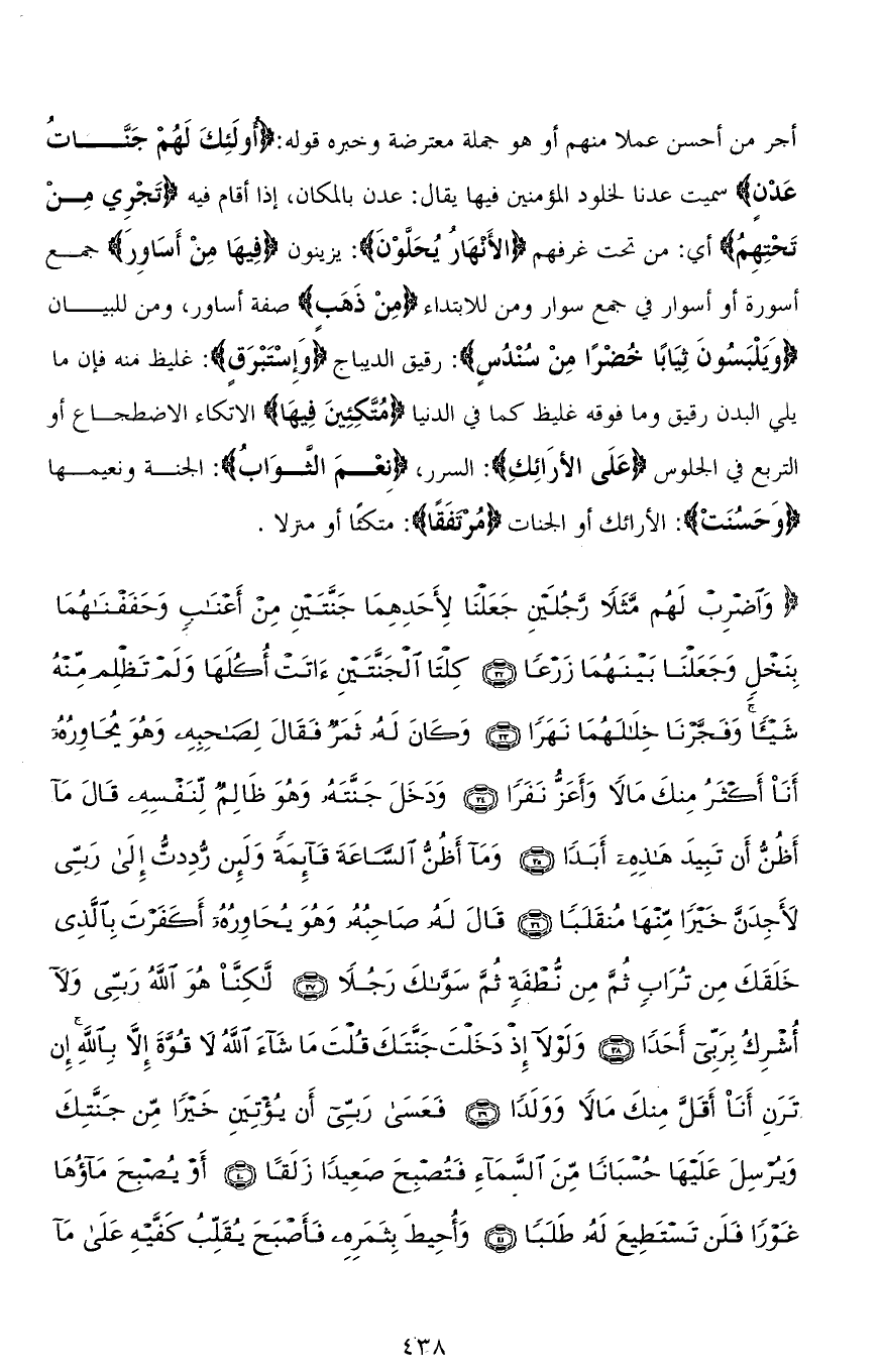 أجر من أحسن عملاً منهم أو هو جملة معترضة وخبره قوله: (أُولَئِكَ لَهُمْ جَنَّاتُ عَدْنٍ) سميت عدنا لخلود المؤمنين فيها يقال: عدن بالمكان، إذا أقام فيه (تَجْرِي مِنْ تَحْتِهِمُ) أي: من تحت غرفهم (الأَنْهَار يُحَلَّوْنَ): يزينون (فِيهَا مِنْ أَسَاوِرَ) جمع أسورة أو أسوار في جمع سوار ومن للابتداء (مِنْ ذَهَبٍ) صفة أساور، ومن للبيان (وَيَلْبَسُونَ ثِيَابًا خُضْرًا مِنْ سُنْدُسٍ): رقيق الديباج (وَإِسْتَبْرَقٍ): غليظ منه فإن ما يلي البدن رقيق وما فوقه غليظ كما في الدنيا (مُتَّكِئِينَ فِيهَا) الاتكاء الاضطجاع أو التربع في الجلوس (عَلَى الأرَائِكِ): السرر، (نِعْمَ الثوَابُ): الجنة ونعيمها (وَحَسُنَتْ): الأرائك أو الجنات (مُرتفَقًا): متكئًا أو منزلاً.