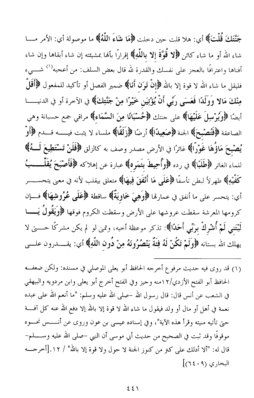 جَنَّتَكَ قُلْتَ) أي: هلا قلت حين دخلت (مَا شَاءَ اللهُ) ما موصولة أي: الأمر ما شاء الله أو ما شاء كائن (لَا قُوَّةَ إِلَّا بِاللهِ) إقرارًا بأنَّهَا بمشيئته إن شاء أبقاها وإن شاء أفناها واعترافًا بالعجز على نفسك والقدرة لله قال بعض السلف: من أعجبه شيء فليقل ما شاء الله لا قوة إلا بالله (إِنْ تَرَنِ أَنَا) ضمير الفصل أو تأكيد للمفعول (أَقَلَّ مِنْكَ مَالًا وَوَلَدًا فعسَى ربي أَد يُؤْتِيَنِ خَيْرًا مِنْ جَنَّتِكَ) في الآخرة أو في الدنيا أيضًا (وَيُرْسِلَ عَلَيْهَا) على جنتك (حُسْبَانًا مِن السَّمَاءِ) مراقي جمع حسبانة وهي الصاعقة (فَتُصْبِحَ) الجنة (صَعِيدًا) أرضًا (زلَقًا) ملساء لا يثبت فيه قدم (أَوْ يُصْبِحَ مَاؤُهَا غَوْرًا) غائرًا في الأرض مصدر وصف به كالزلق (فَلَن تَسْتَطِيعَ لَهُ) للماء الغائر (طَلَبًا) في رده (وأحيطَ بثَمَرهِ) عبارة عن إهلاكه (فأَصْبَحَ يُقَلِّب كَفَّيْهِ) [ظهرًا] لبطن تأسفًا (عَلَى مَا أَنفقَ فِيهَا) متعلق بـ يُقَلِّب لأنه في معنى يتحسر أي: يتحسر على ما أنفق في عمارتها (وَهِيَ خَاوِيَةٌ) ساقطة (عَلَى عُرُوشِهَا) فإن كرومها المعرشة سقطت عروشها على الأرض وسقطت الكروم فوقها (وَيَقُولُ يَا لَيْتَنِي لَمْ أُشْرِكْ بِرَبِّي أَحَدًا): تذكر موعظة أخيه، وتمني لو لم يكن مشركًا حتى لا يهلك الله بستانه (وَلَمْ تَكُنْ لَهُ فِئَةٌ يَنْصُرُونَهُ مِنْ دُونِ اللهِ) أي: يقدرون على