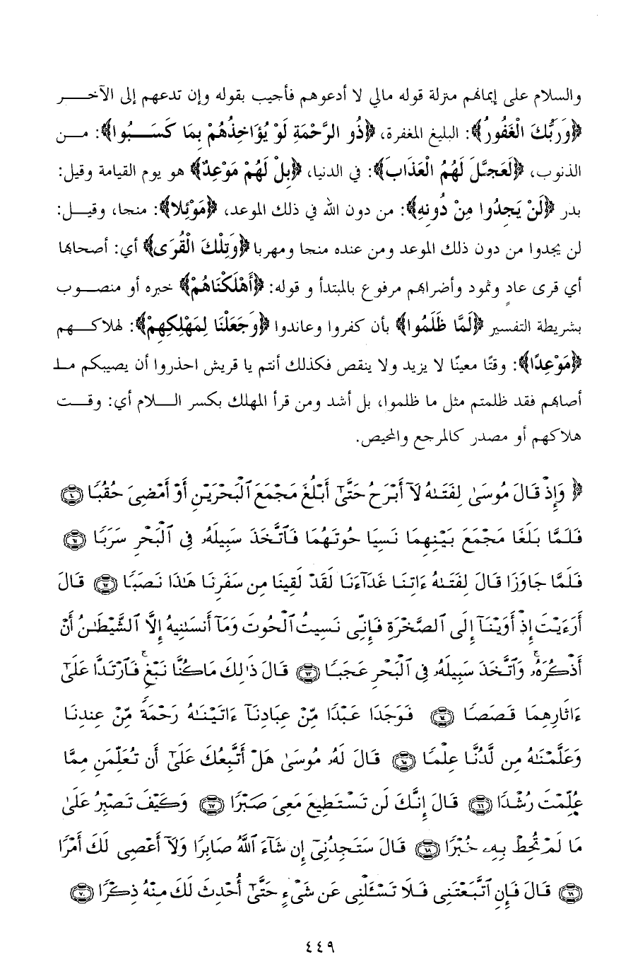 (وَإِذْ قَالَ مُوسَى لِفَتَاهُ لَا أَبْرَحُ حَتَّى أَبْلُغَ مَجْمَعَ الْبَحْرَيْنِ أَوْ أَمْضِيَ حُقُبًا (60) فَلَمَّا بَلَغَا مَجْمَعَ بَيْنِهِمَا نَسِيَا حُوتَهُمَا فَاتَّخَذَ سَبِيلَهُ فِي الْبَحْرِ سَرَبًا (61) فَلَمَّا جَاوَزَا قَالَ لِفَتَاهُ آتِنَا غَدَاءَنَا لَقَدْ لَقِينَا مِنْ سَفَرِنَا هَذَا نَصَبًا (62) قَالَ أَرَأَيْتَ إِذْ أَوَيْنَا إِلَى الصَّخْرَةِ فَإِنِّي نَسِيتُ الْحُوتَ وَمَا أَنْسَانِيهُ إِلَّا الشَّيْطَانُ أَنْ أَذْكُرَهُ وَاتَّخَذَ سَبِيلَهُ فِي الْبَحْرِ عَجَبًا (63) قَالَ ذَلِكَ مَا كُنَّا نَبْغِ فَارْتَدَّا عَلَى آثَارِهِمَا قَصَصًا (64) فَوَجَدَا عَبْدًا مِنْ عِبَادِنَا آتَيْنَاهُ رَحْمَةً مِنْ عِنْدِنَا وَعَلَّمْنَاهُ مِنْ لَدُنَّا عِلْمًا (65) قَالَ لَهُ مُوسَى هَلْ أَتَّبِعُكَ عَلَى أَنْ تُعَلِّمَنِ مِمَّا عُلِّمْتَ رُشْدًا (66) قَالَ إِنَّكَ لَنْ تَسْتَطِيعَ مَعِيَ صَبْرًا (67) وَكَيْفَ تَصْبِرُ عَلَى مَا لَمْ تُحِطْ بِهِ خُبْرًا (68) قَالَ سَتَجِدُنِي إِنْ شَاءَ اللهُ صَابِرًا وَلَا أَعْصِي لَكَ أَمْرًا (69) قَالَ فَإِنِ اتَّبَعْتَنِي فَلَا تَسْأَلْنِي عَنْ شَيْءٍ حَتَّى أُحْدِثَ لَكَ مِنْهُ ذِكْرًا (70)