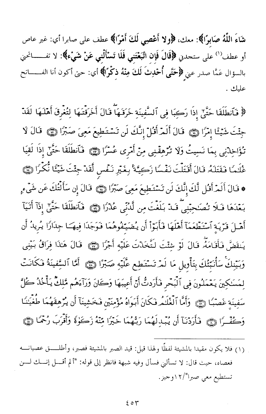 (فَانْطَلَقَا حَتَّى إِذَا رَكِبَا فِي السَّفِينَةِ خَرَقَهَا قَالَ أَخَرَقْتَهَا لِتُغْرِقَ أَهْلَهَا لَقَدْ جِئْتَ شَيْئًا إِمْرًا (71) قَالَ أَلَمْ أَقُلْ إِنَّكَ لَنْ تَسْتَطِيعَ مَعِيَ صَبْرًا (72) قَالَ لَا تُؤَاخِذْنِي بِمَا نَسِيتُ وَلَا تُرْهِقْنِي مِنْ أَمْرِي عُسْرًا (73) فَانْطَلَقَا حَتَّى إِذَا لَقِيَا غُلَامًا فَقَتَلَهُ قَالَ أَقَتَلْتَ نَفْسًا زَكِيَّةً بِغَيْرِ نَفْسٍ لَقَدْ جِئْتَ شَيْئًا نُكْرًا (74) قَالَ أَلَمْ أَقُلْ لَكَ إِنَّكَ لَنْ تَسْتَطِيعَ مَعِيَ صَبْرًا (75) قَالَ إِنْ سَأَلْتُكَ عَنْ شَيْءٍ بَعْدَهَا فَلَا تُصَاحِبْنِي قَدْ بَلَغْتَ مِنْ لَدُنِّي عُذْرًا (76) فَانْطَلَقَا حَتَّى إِذَا أَتَيَا أَهْلَ قَرْيَةٍ اسْتَطْعَمَا أَهْلَهَا فَأَبَوْا أَنْ يُضَيِّفُوهُمَا فَوَجَدَا فِيهَا جِدَارًا يُرِيدُ أَنْ يَنْقَضَّ فَأَقَامَهُ قَالَ لَوْ شِئْتَ لَاتَّخَذْتَ عَلَيْهِ أَجْرًا (77) قَالَ هَذَا فِرَاقُ بَيْنِي وَبَيْنِكَ سَأُنَبِّئُكَ بِتَأْوِيلِ مَا لَمْ تَسْتَطِعْ عَلَيْهِ صَبْرًا (78) أَمَّا السَّفِينَةُ فَكَانَتْ لِمَسَاكِينَ يَعْمَلُونَ فِي الْبَحْرِ فَأَرَدْتُ أَنْ أَعِيبَهَا وَكَانَ وَرَاءَهُمْ مَلِكٌ يَأْخُذُ كُلَّ سَفِينَةٍ غَصْبًا (79) وَأَمَّا الْغُلَامُ فَكَانَ أَبَوَاهُ مُؤْمِنَيْنِ فَخَشِينَا أَنْ يُرْهِقَهُمَا طُغْيَانًا وَكُفْرًا (80) فَأَرَدْنَا أَنْ يُبْدِلَهُمَا رَبُّهُمَا خَيْرًا مِنْهُ زَكَاةً وَأَقْرَبَ رُحْمًا (81)