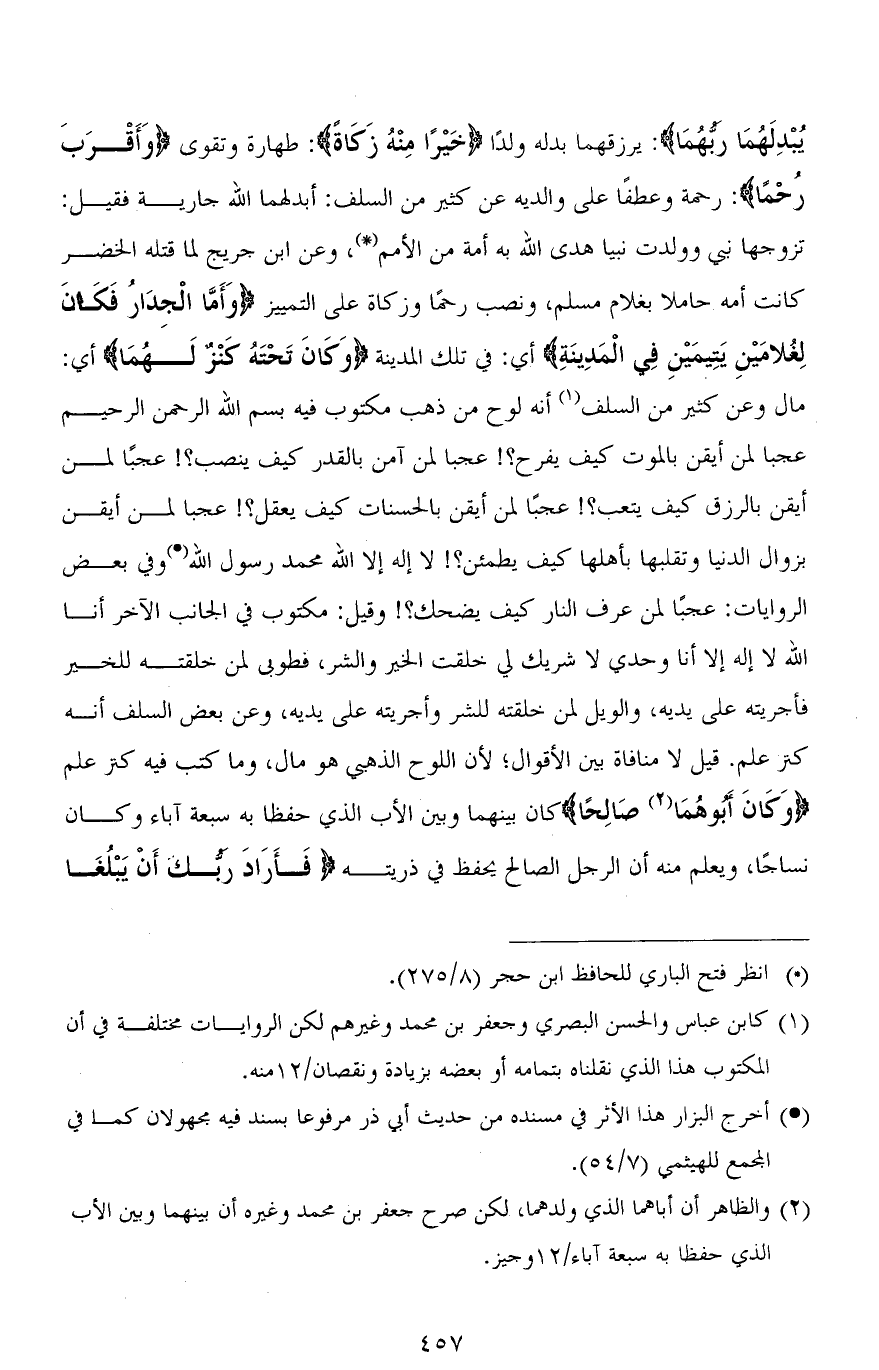 يُبْدِلَهُمَا رَبُّهُمَا): يرزقهما بدله ولدًا (خَيْرًا مِنْهُ زَكَاةً): طهارة وتقوى (وَأَقْرَبَ رُحْمًا): رحمة وعطفًا على والديه عن كثير من السلف: أبدلهما الله جارية فقيل: تزوجها نبي وولدت نبيا هدى الله به أمة من الأمم، وعن ابن جريج لما قتله الخضر كانت أمه حاملاً بغلام مسلم، ونصب رُحْمًا وزَكَاةً على التمييز (وَأَمَّا الْجِدَارُ فَكَانَ لِغُلامَيْنِ يَتِيمَيْنِ فِي الْمَدِينَةِ) أي: في تلك المدينة (وَكَانَ تَحْتَهُ كَنْزٌ لَهُمَا) أي: مال وعن كثير من السلف أنه لوح من ذهب مكتوب فيه بسم الله الرحمن الرحيم عجبًا لمن أيقن بالموت كيف يفرح؟! عجبًا لمن آمن بالقدر كيف ينصب؟! عجبًا لمن أيقن بالرزق كيف يتعب؟! عجبًا لمن أيقن بالحسنات كيف يعقل؟! عجبًا لمن أيقن بزوال الدنيا وتقلبها بأهلها كيف يطمئن؟! لا إله إلا الله محمد رسول الله وفي بعض الروايات: عجبًا لمن عرف النار كيف يضحك؟! وقيل: مكتوب في الجانب الآخر أنا الله لا إله إلا أنا وحدي لا شريك لي خلقت الخير والشر، فطوبى لمن خلقته للخير فأجريته على يديه، والويل لمن خلقته للشر وأجريته على يديه، وعن بعض السلف أنه كنز علم. قيل لا منافاة بين الأقوال؛ لأن اللوح الذهبي هو مال، وما كتب فيه كنز علم (وَكَانَ أَبُوهُمَا صَالِحًا) كان بينهما وبين الأب الذي حفظا به سبعة آباء وكان نساجًا، ويعلم منه أن الرجل الصالح يحفظ في ذريته (فَأَرَادَ رَبُّكَ أَنْ يَبْلُغَا