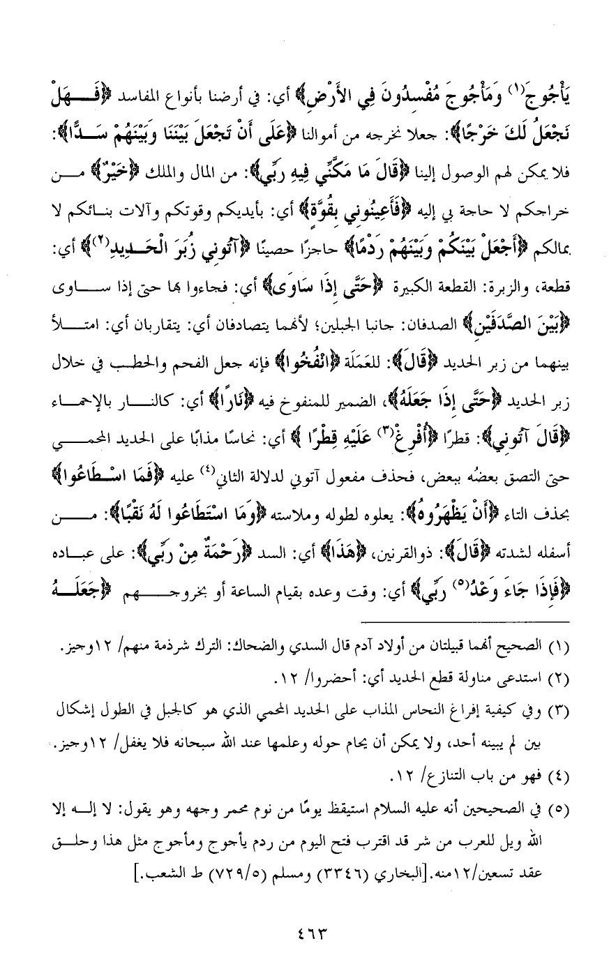 يَأْجُوجَ وَمَأْجُوجَ مُفْسِدُونَ فِي الْأَرْضِ) أي: في أرضنا بأنواع المفاسد (فَهَلْ نَجْعَلُ لَكَ خَرْجًا): جعلا نخرجه من أموالنا (عَلَى أَنْ تَجْعَلَ بَيْنَنَا وَبَيْنَهُمْ سَدًّا): فلا يمكن لهم الوصول إلينا (قَالَ مَا مَكَّنِّي فِيهِ رَبِّي): من المال والملك (خَيْرٌ) من خراجكم لا حاجة بي إليه (فَأَعِينُونِي بِقُوَّةٍ) أي: بأيديكم وقوتكم وآلات بنائكم لا بمالكم (أَجْعَلْ بَيْنَكُمْ وَبَيْنَهُمْ رَدْمًا) حاجزًا حصينًا (آتُونِي زُبَرَ الْحَدِيدِ) أي: قطعة، والزبرة: القطعة الكبيرة (حَتَّى إِذَا سَاوَى) أي: فجاءوا بها حتى إذا ساوى (بَيْنَ الصَّدَفَيْنِ) الصدفان: جانبا الجبلين، لأنهما يتصادفان أي: يتقاربان أي: امتلأ بينهما من زبر الحديد (قَالَ): للعَمَلَة (انْفُخُوا) فإنه جعل الفحم والحطب في خلال زبر الحديد (حَتَّى إِذَا جَعَلَهُ)، الضمير للمنفوخ فيه (نَارًا) أي: كالنار بالإحماء (قَالَ آتونِي): قطرًا (أفْرِغْ عَلَيْهِ قِطْرًا) أي: نحاسًا مذابًا على الحديد المحمي حتى التصق بعضُه ببعض، فحذف مفعول آتوني لدلالة الثاني عليه (فَمَا اسْطَاعُوا) بحذف التاء (أَنْ يَظْهَرُوهُ): يعلوه لطوله وملاسته (وَمَا اسْتَطَاعُوا لَهُ نَقْبًا): من أسفله لشدته (قَالَ): ذو القرنين، (هَذَا) أي: السد (رَحْمَةٌ مِنْ ربي): على عباده (فَإِذَا جَاءَ وَعْدُ رَبِّي) أي: وقت وعده بقيام الساعة أو بخروجهم (جَعَلَهُ